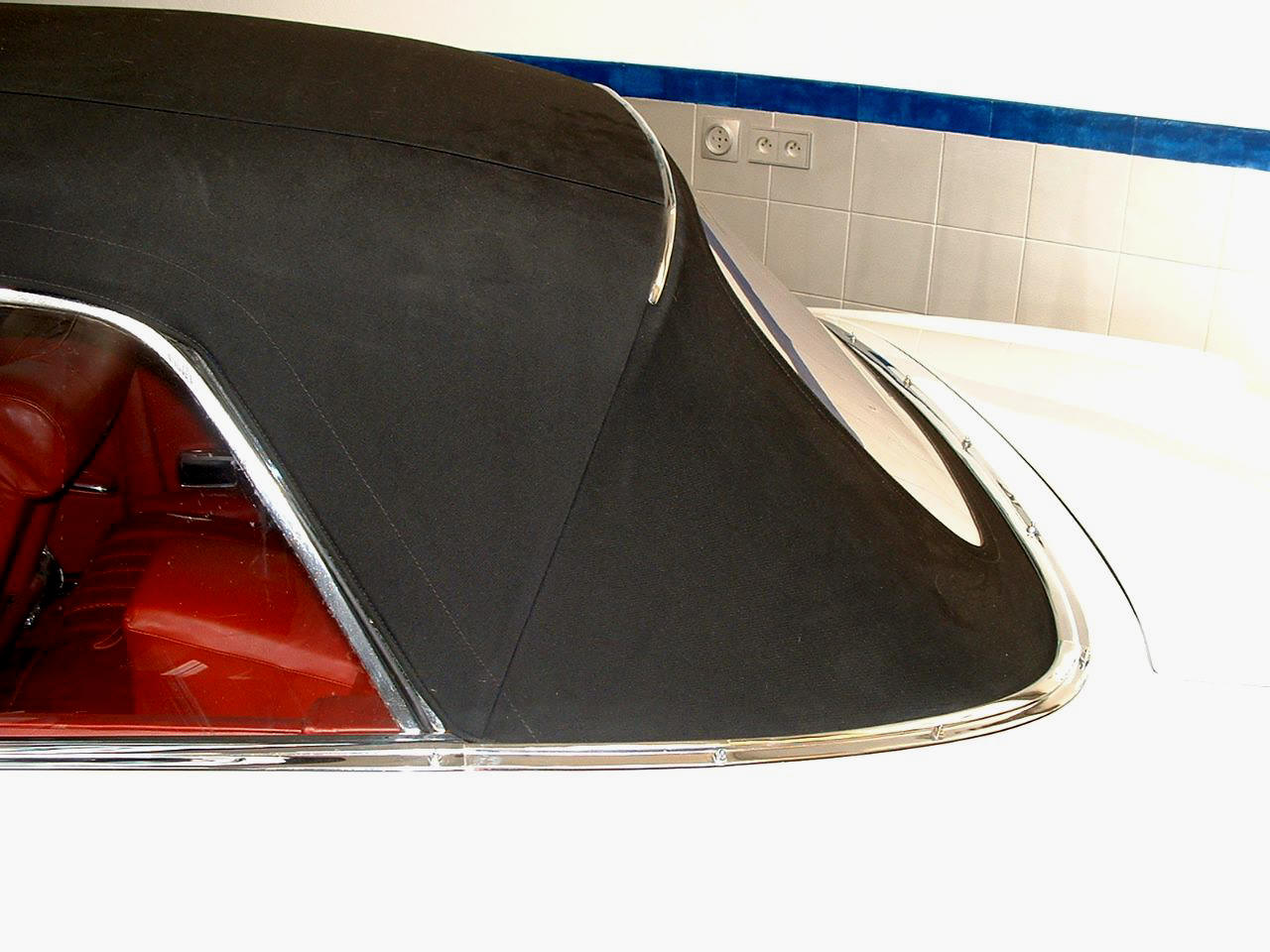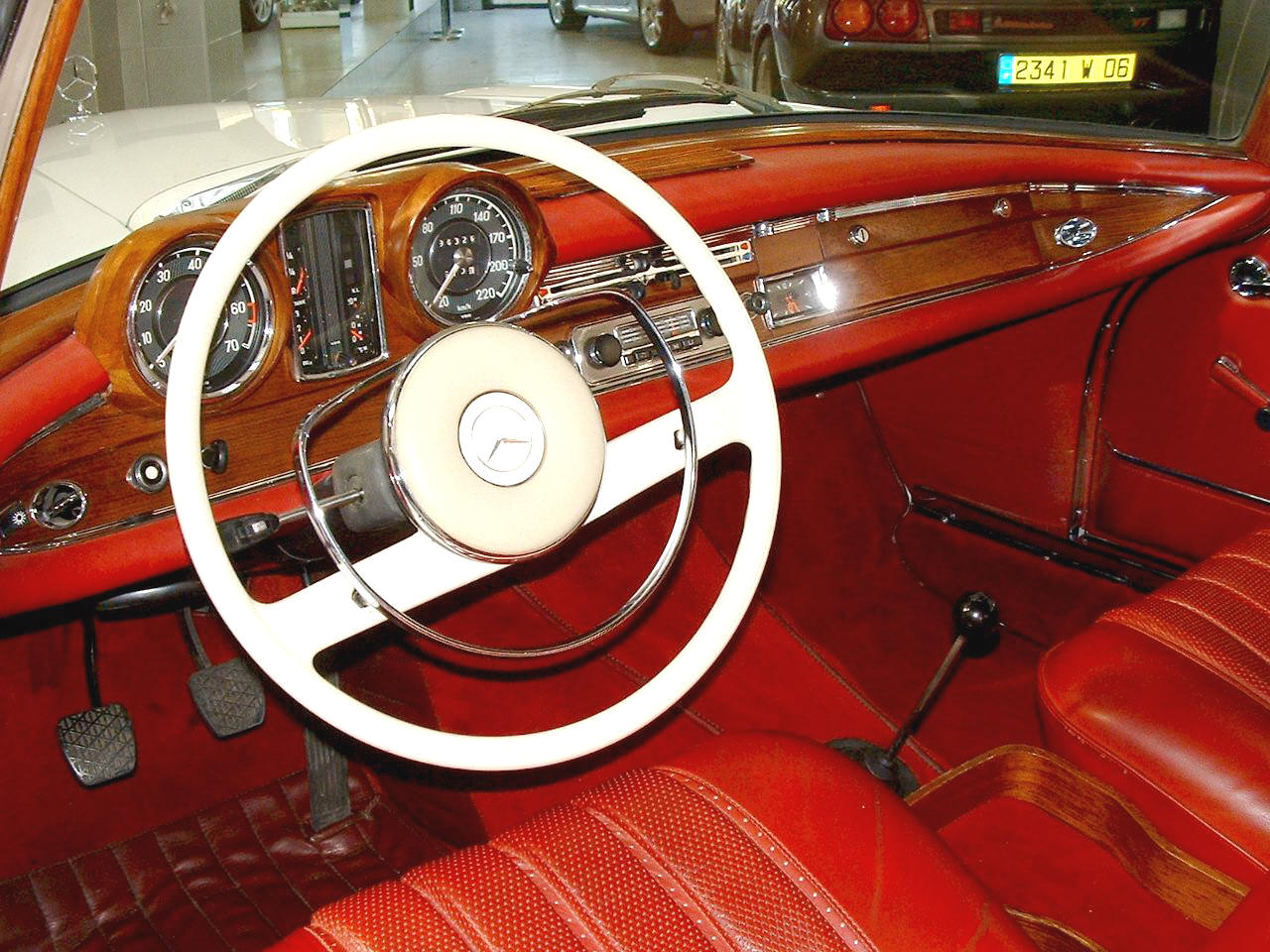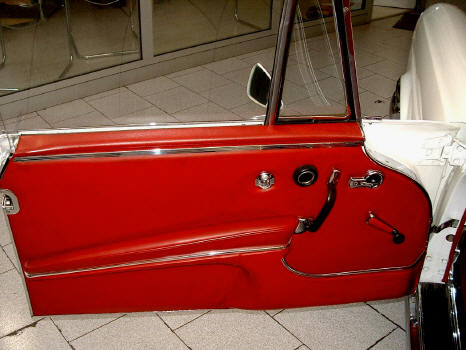 Cette voiture est en état à la fois vraiment excellent et conforme à l'origine, avec un intérieur en cuir rouge très beau, qui semble avoir été préservé de l'usure des années, une capote neuve. La carrosserie comporte des éléments remplacés par du neuf afin de présenter les lignes tendues et parfaites voulues par le styliste. le résultat est atteint, avec une peinture blanche absolument magnifique.