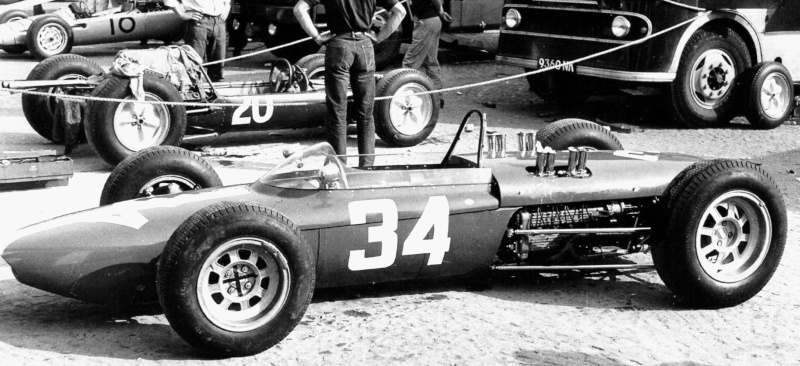 De Tomaso Formule 1 à Monza en 1962 (avec un intéressant moteur flat-8, peut-être issu de deux moteurs Osca 4 cylidnres).