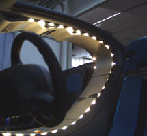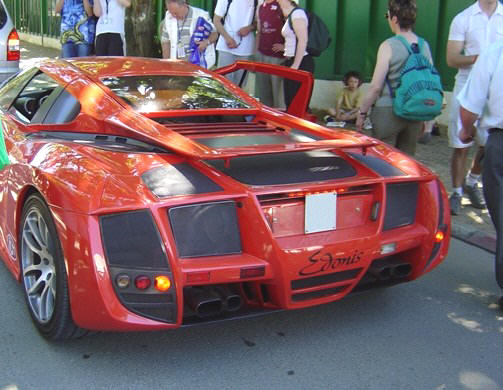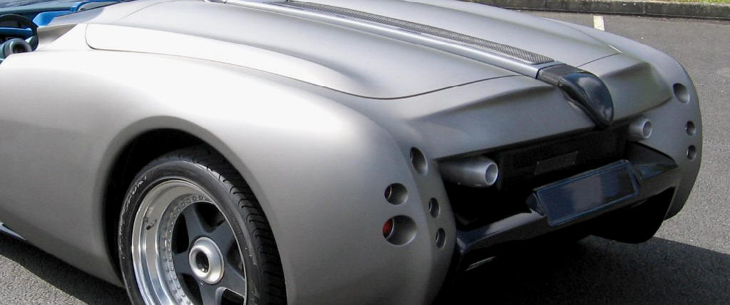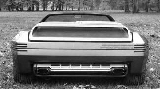The rear part of the car is muscular and animal, almost excessively long and wide, and structured around a giant saurian backbone, seeming to hide the reactors of a spaceship. A ground-effect extractor underlines the innnovative volume arrangement of the back : the enormous engine lid and the rear fenders end in areodynamic shapes, only pierced by orifices echoing the futurist headlights, whilst the exhaust pipes exhale hot gases into the air...