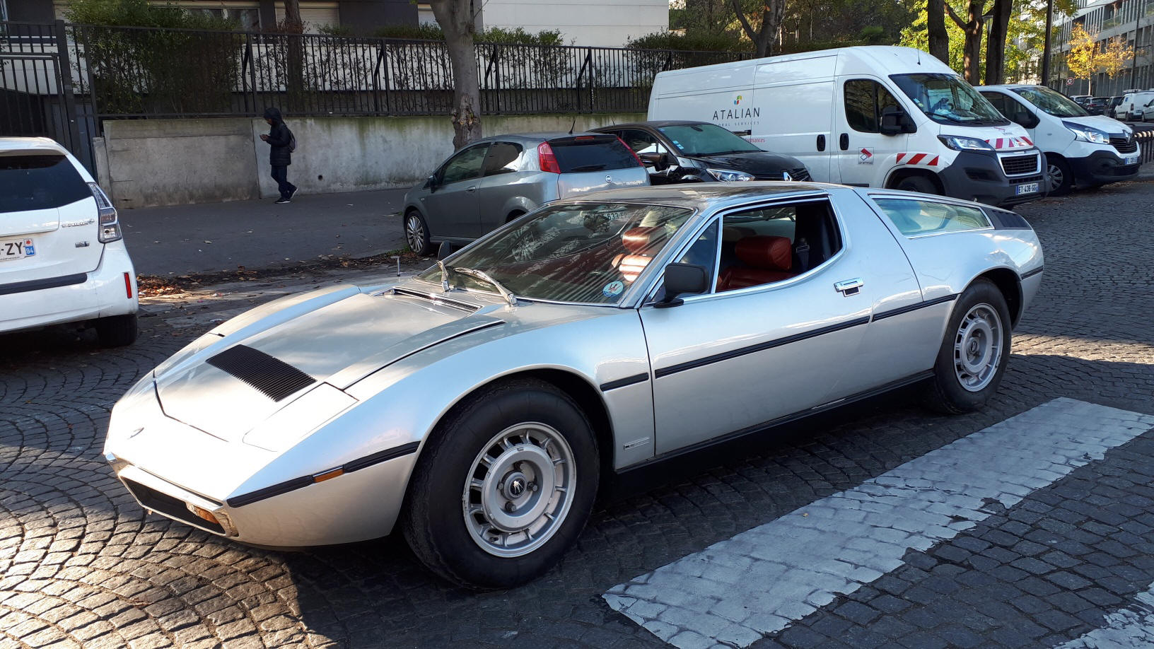 Maserati Bora : une des premières supercars de l'Histoire avec la Miura, la Ferrari Daytona et la Countach (ci-dessus la voiture en vente, photographiée à Paris) |