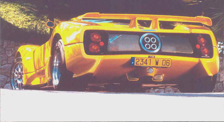 Unlike many would-be super-cars, the Pagani Zonda has actually hit the road ! The very first cars have been delivered to a limited number of "happy-few", in France and in Belgium. The people of the Riviera and of Monaco have a chance to get a glance of one of the first Zondas, finished in bright yellow (in the surroundings of AUTODROME, of course!). You have to be lucky, since this is a true thoroughbred, so fast that you mostly see it from the back like on the picture below !