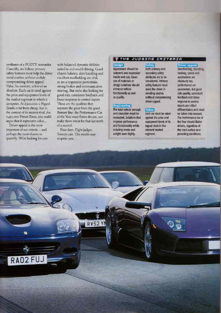 Les critères utilisés sont : style (design) , conception et qualité de fabrication (engineering), sécurité active et passive, "plaisir" (driver's appeal...), c'est-à-dire tenue de route, vitesse, accélération, sensations de conduite en toutes situations et sur tous revêtements.