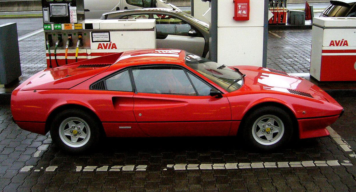 Actually the mighty 400 HP 288 GTO, the first Ferrari "Super Car" was closely derived form the 308 GTB: with also a 3-litre V8 engine – but with turbos – it retains the same style, though with more "body-built" shapes.