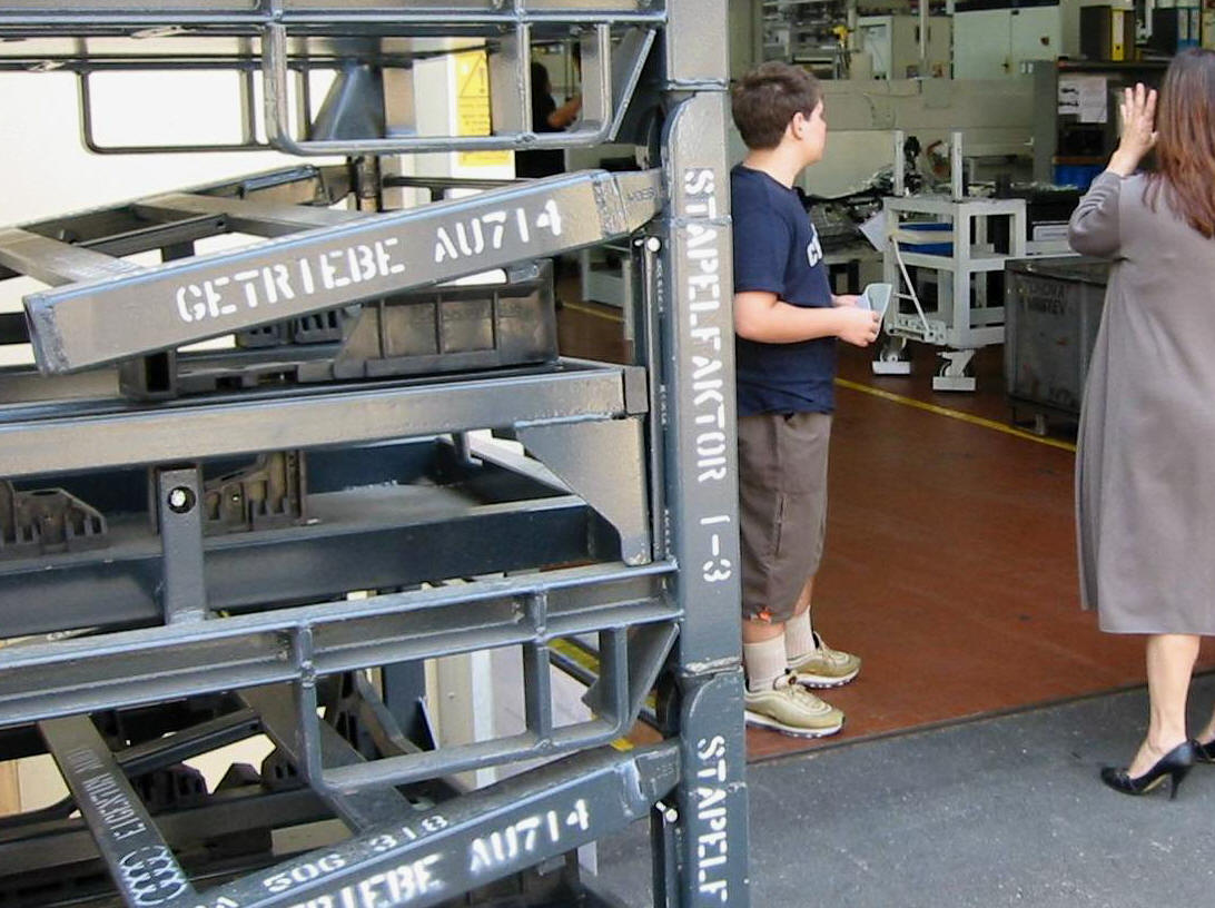 Chez Lamborghini à Sant'Agata, les palettes servant à livrer les pièces de moteur portent le sigle Audi (en bas à gauche).