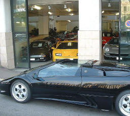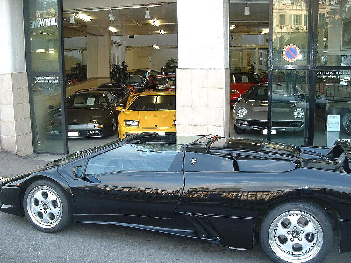 Dablo VT, Miura SVJ Spider à toit Targa (unique, Collection Autodrome - finie en vert clair aujourd'hui, en argenté autrefois), et Diablo Roadster devant le show room Autodrome Cannes.