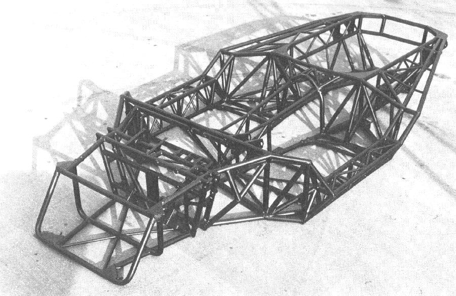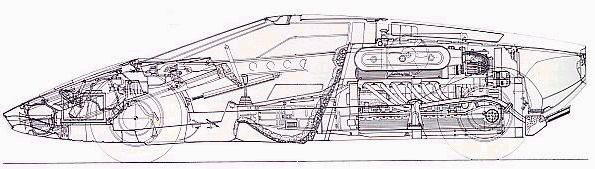 The very complex but stiff and light (90 kg) chassis of the Countach : directly inspired by racing cars.
