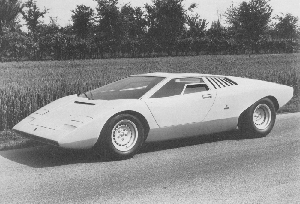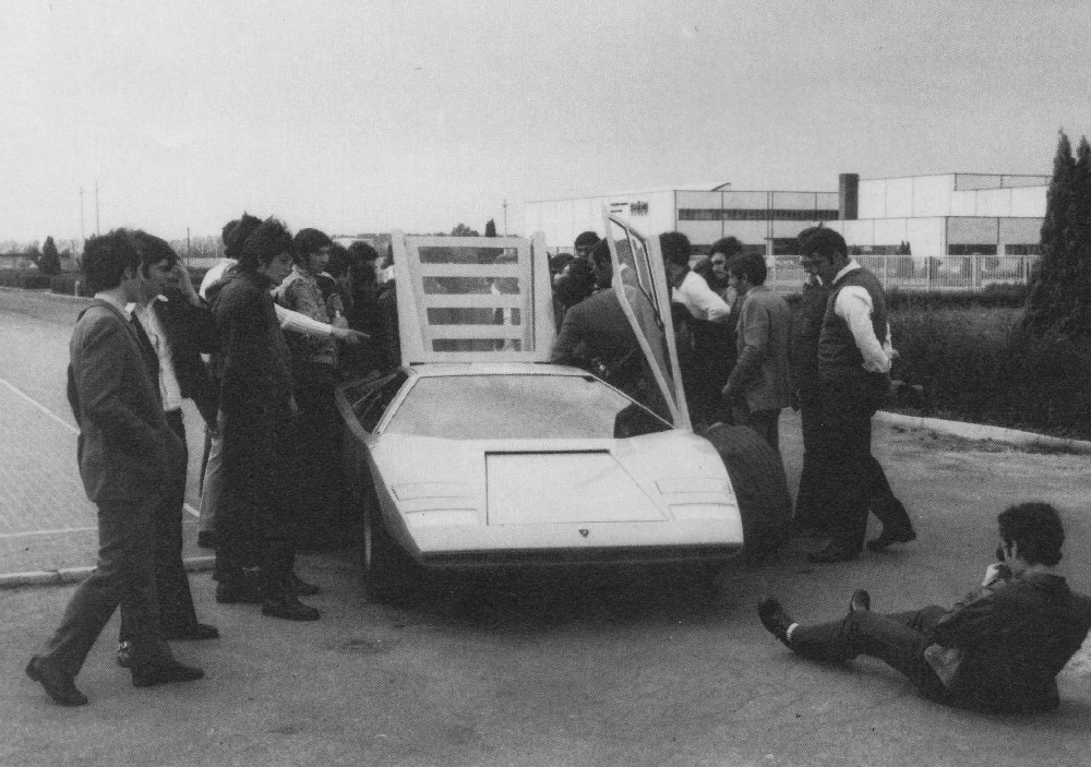 La présentation du premier prototype LP500 (trois photos de gauche) en 1971 suscite l'enthousiasme et l'incrédulité: on se rue vers elle, on se couche par terre pour mieux la photographier, c'est la création des ingénieurs les plus passionnants de leur génération.