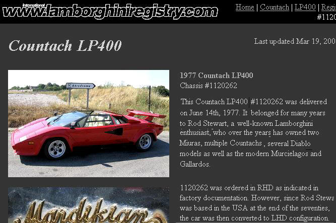 Cette Countach est sortie d'usine le 14 juin 1977. Son numéro de châssis est #1120262. Elle fut la propriété du chanteur Rod Stewart, grand amateur de super cars : il posséda aussi deux Lamborghini Miura, dont une SV, et une Diablo. La voiture fut commandée en conduite à droite selon les archives de l'usine (nous possédons une copie du registre dans le dossier historique de l'auto) ; mais du fait que Rod Stewart s'expatria aux Etats-Unis à la fin des seventies, l'auto fut re-configurée en conduite à gauche.