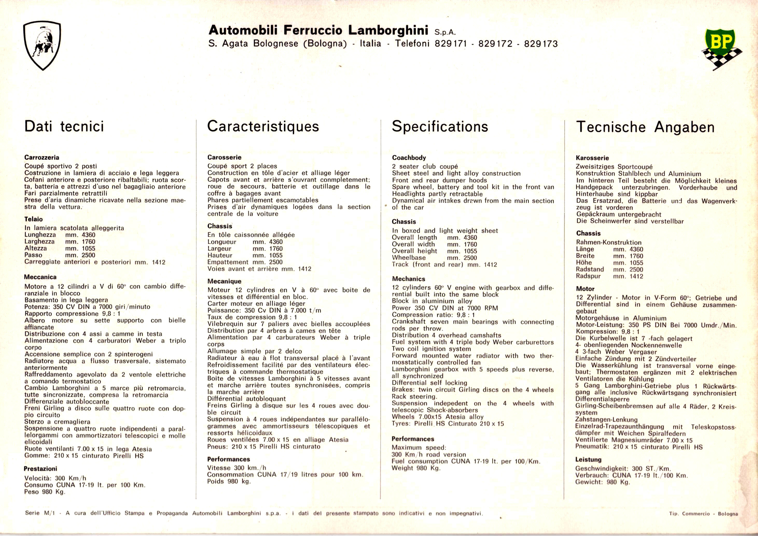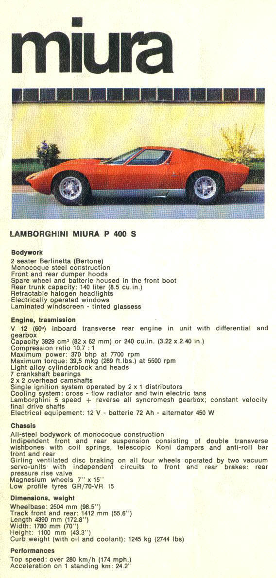 125 toutes premières Miura - c'est la 85ème construite - dont le châssis en acier plus mince - 0.9 mm contre 1.0 mm plus tard - signifiait une voiture plus légère que toutes celles qui furent produites par la suite, les Miura normales de seconde série, puis les S et SV.Nous possédons dans nos archives un exemplaire de la toute première brochure de la Miura, qui indique un poids de 980 kilos - et une vitesse de 300 km/h..