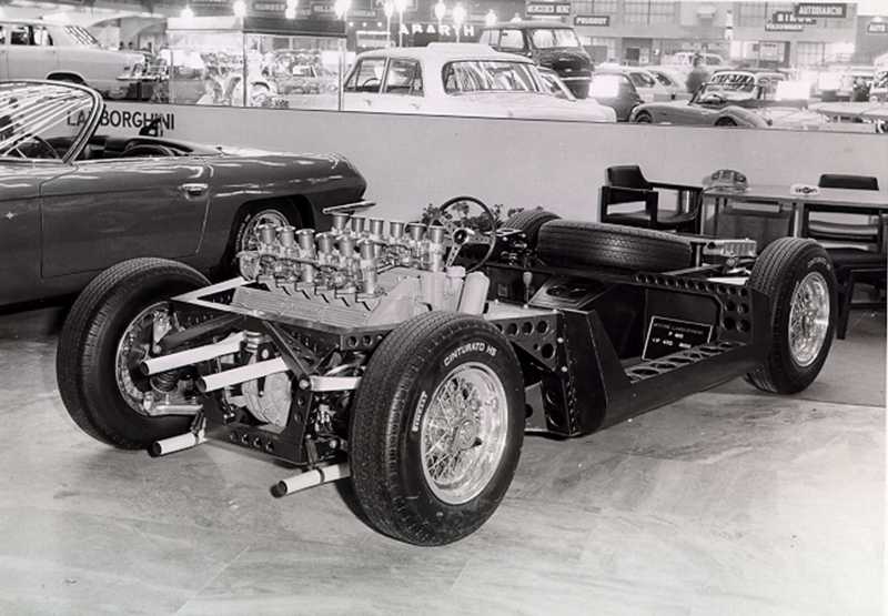 Turin, 1965 : le châssis exposé par Lamborghini de son nouveau projet de sportive biplace, encore anonyme,