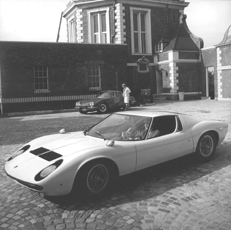 Photo de presse: la Miura avec en arrière-plan la 400GT second modèle de la marque Lamborghini ; la fondatrice était bien sûr la 350 GT.