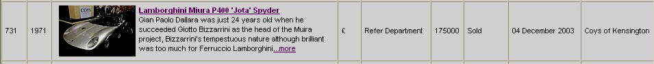 2003 : Le 26 Mai 2003 elle est proposée aux enchères lors de la vente Bonhams Les Grandes Marques à Monaco. Elle est décrite ainsi dans le catalogue de la vente : "The ex-Geneva Motor Show,1971 Lamborghini Miura P400S "Jota" Spider, coachwork by Bertone/Lambomotor AG". Déclarée vendue pour 80.000 € + frais, il est évidemment très probable que la transaction se soit plutôt faite de gré à gré et pour un montant bien supérieur (l'estimation était 120-150.000 €).