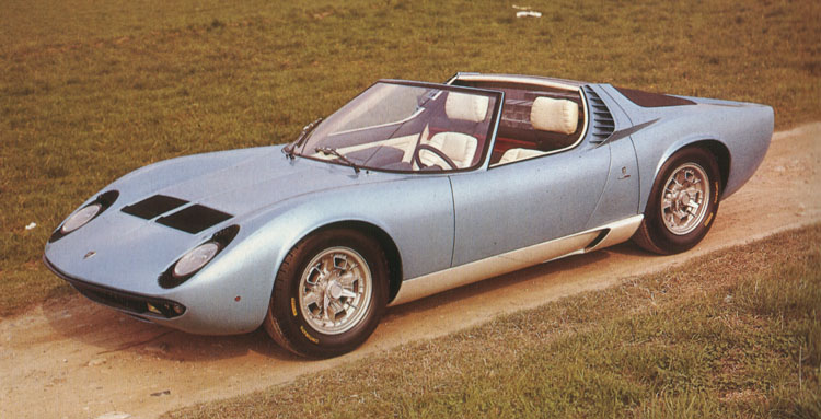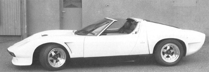 Rare photo d'époque du spider Miura avec le toit en place ; elle fut montrée avec et sans aileron (ci-dessous).