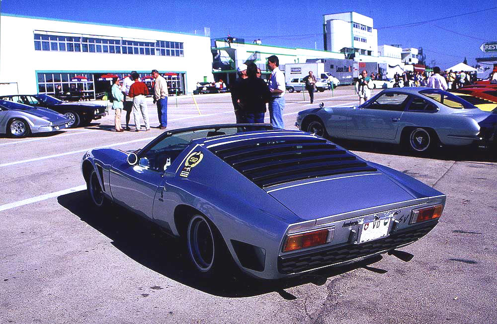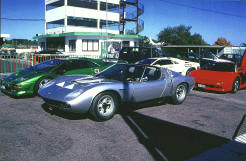 L to R: Flying Star II Touring at Autodrome-Cannes, incredible Marzal, famous Miura Roadster by Bertone, and "final" Miura SVJ Spider.
