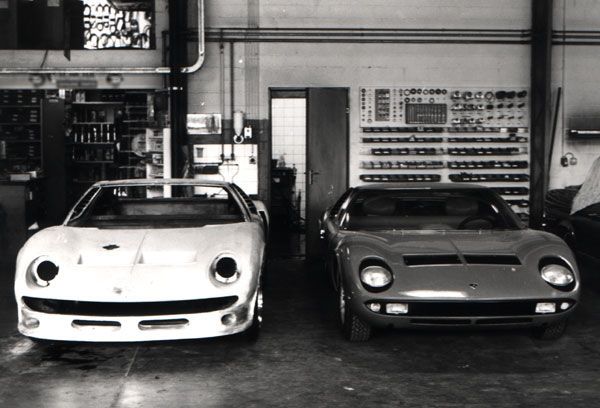 Une vue du Spider 4808 au moment des travaux en 1980, à côte d'une Miura S.