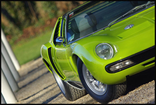 Cette Lamborghini célèbre est désormais la propriété d'une de nos clients collectionneur, pour qui nous l'avons restaurée en carrosserie, peinture et sellerie - travaux confiés à la Carrosserie Lecoq. Comme chaque possesseur dans la chaîne historique des collectionneurs qui ont été en charge de cette automobile, il a souhaité, puisqu'elle avait déjà eu plusieurs livrées successives (jaune à Turin en 71, blanche en 1981 à Genève, et plus récemment gris argent) de lui offrir un coloris d'époque, le fameux Vert Citron qui contribua à la personnalité des Miura.