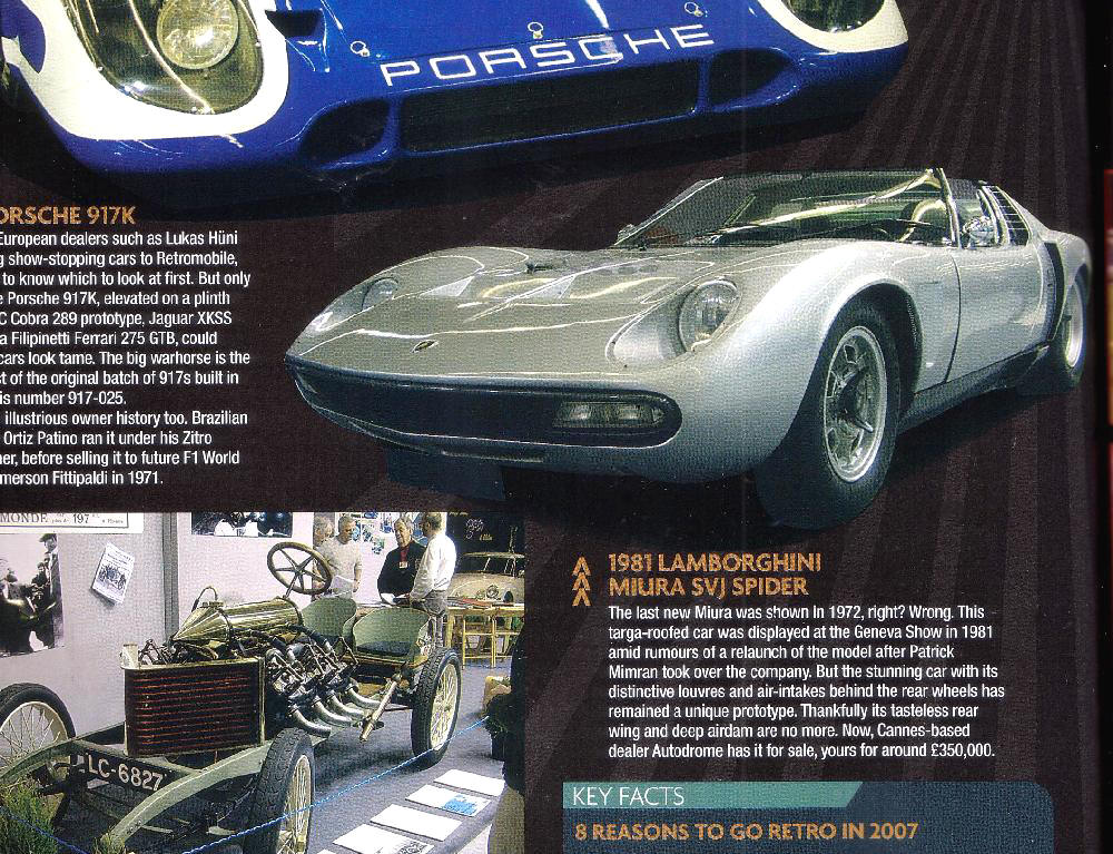 2006, February : The Miura SVJ Spider is displayed at the Paris Rétromobile Classic Motor Show, and pictured in the May 06 issue of Classic & Throughbred magazine, as one of the stars of the Show.