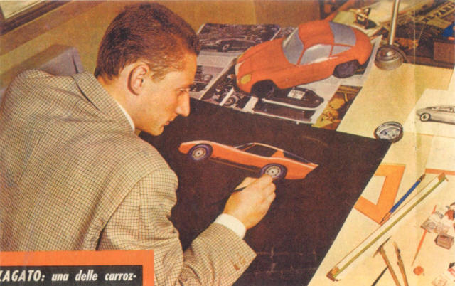 Ercole Spada et la future Alfa-Romeo TZ. Les outils du jeune prodige: crayon, compas, règle, tubes de couleur.