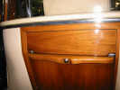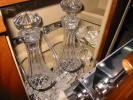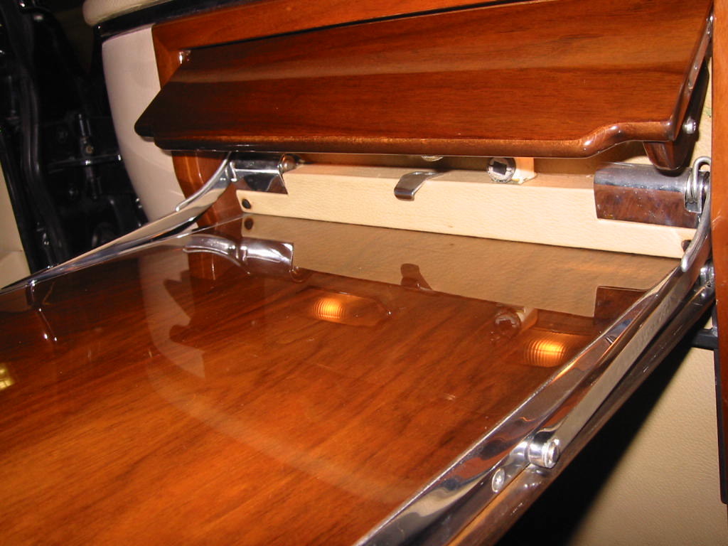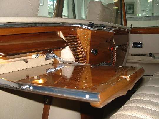 Cette automobile est équipée d'une séparation vitrée entre chauffeur et passagers, la paroi de verre montée sur bois vernis pouvant s'escamoter vers le bas en réunissant les deux espaces intérieurs. Le compartiment arrière est équipé d'un bar à liqueurs avec cristallerie (laquelle n'a jamais été utilisée) logé dans un espace réservé entre les passagers. Deux tablettes dépliantes montées sur supports articulés en laiton chromé permettent de disposer d'une surface pour travailler, poser un verre, ou toute autre usage. Un volet en bois abrite les lampes de lecture éclairant cette tablette comme il convient.