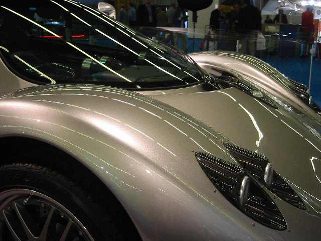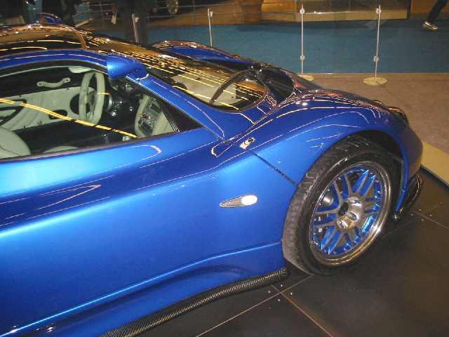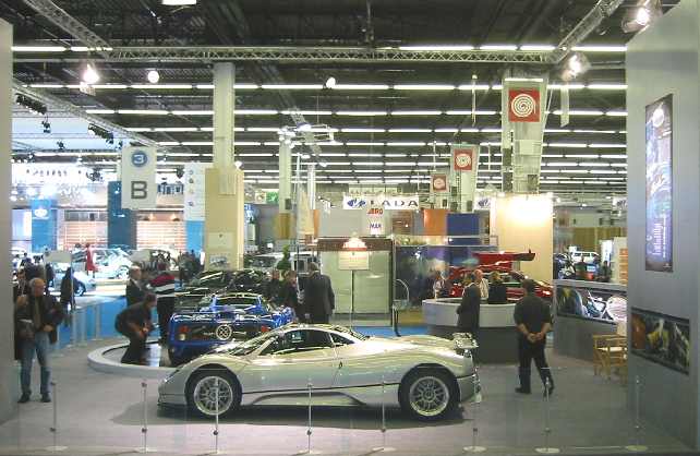 Sur le stand AUTODROME - PAGANI, deux voitures étaient présentées (ci-dessous): l'une couleur argent, l'autre d'un bleu vif métal (les deux couleurs de la marque) sont des C12 S - 7,3 litres. La Zonda gris métallisé était à conduite à droite, car elle sera livrée prochainement en Angleterre.