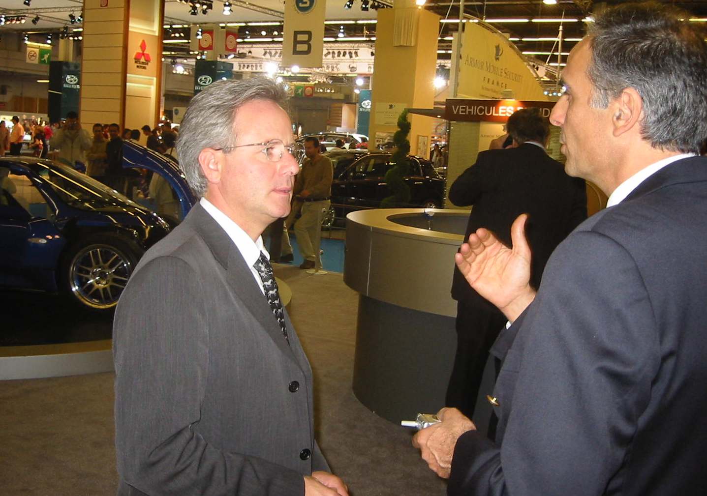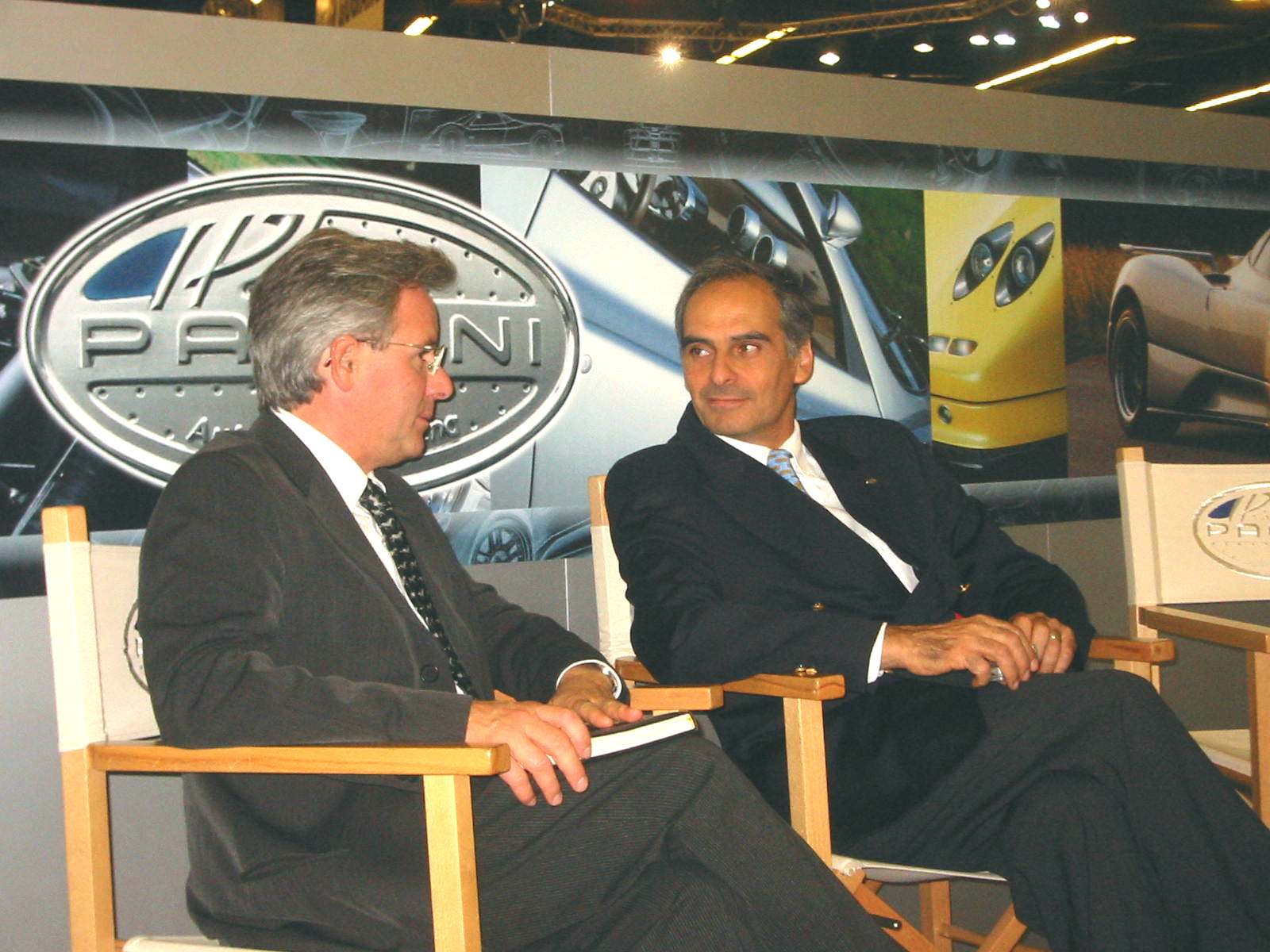 Claude Levy en pleine conversation avec le Commendatore Horacio Pagani sur le Stand AUTODROME au Mondial de Paris.