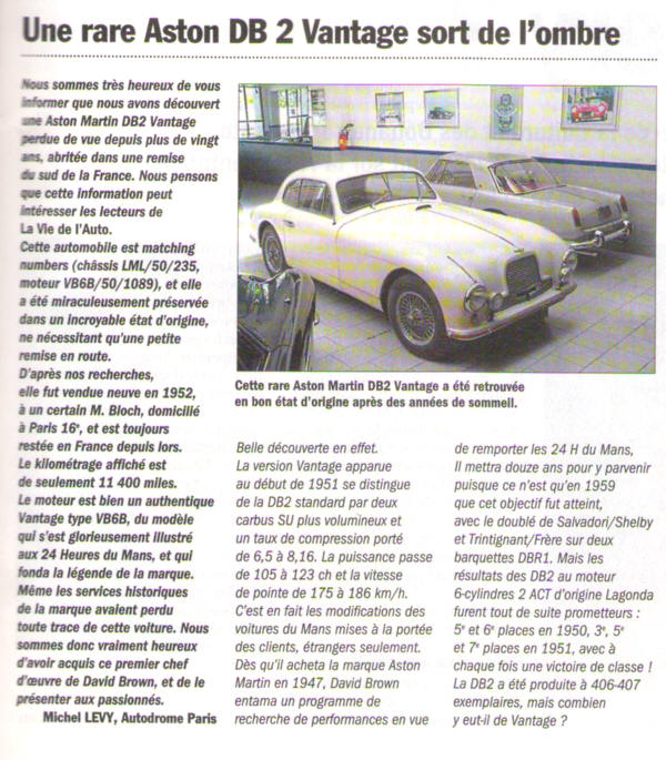 Il est vrai que le vrai collectionneur n'est jamais rassasié ; toute belle auto ancienne procure un immense plaisir, mais quand on est vraiment passionné on ne peut s'empêcher de rechercher la prochaine, voire toutes celles qui sont encore à découvrir... Cette Aston Martin est un vrai bonheur, tant son état est demeuré inchangé à travers les années. Les meilleurs journaux consacrés à l'Automobile Classiques ne s'y trompent pas, et consacrent une place justifiée à ces trouvailles, notamment lorsqu'il s'agit de très rares et légendaires autos sportives comme cette DB2. Nous en possédons la feuille de sortie d'usine avec les détails de sa construction. Un régal de connaisseur.