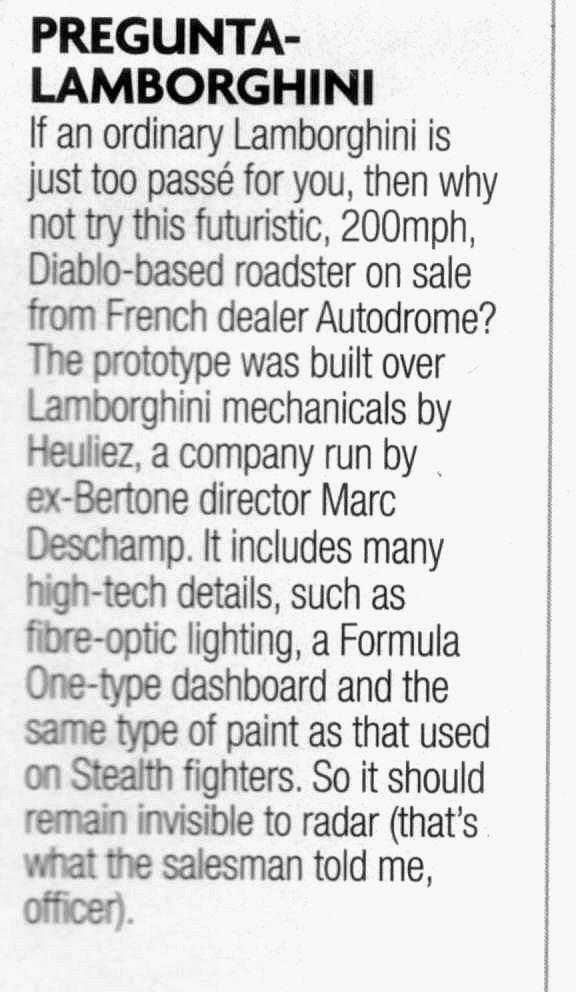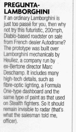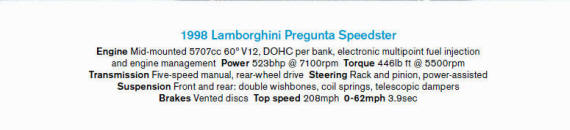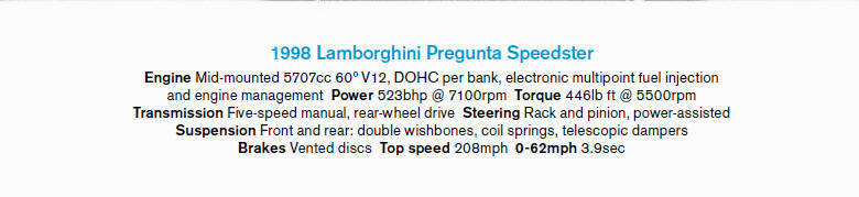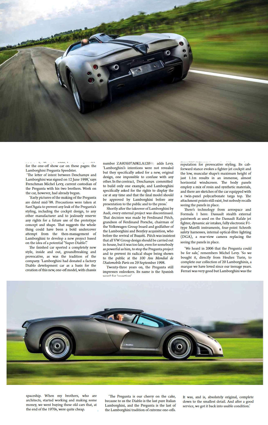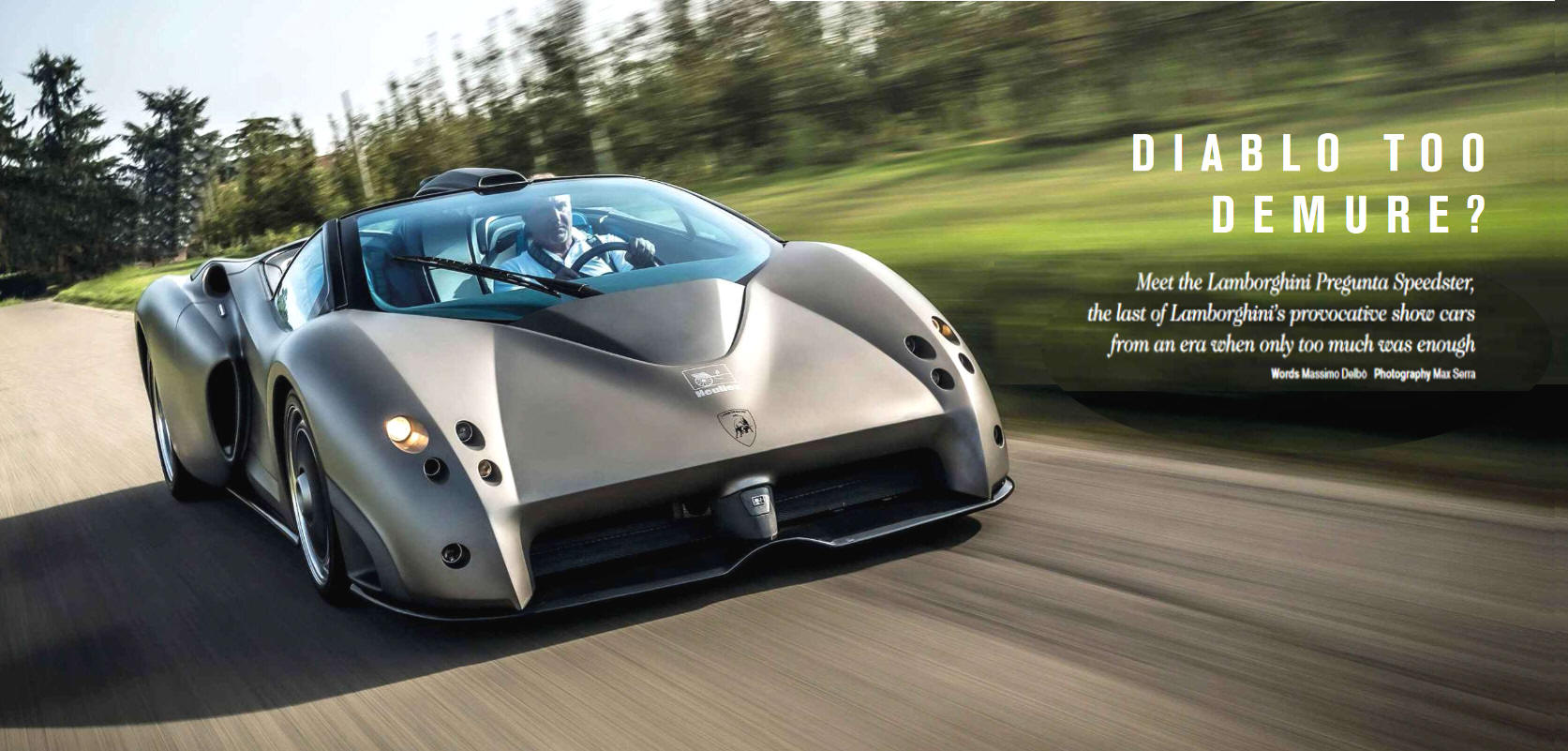 Octane présente la Pregunta en vedette de son numéro d'Octobre. Ce phénoménal prototype fonctionnel fut construit sur la base d'un châssis Diablo de développement usine, dans des conditions mystérieuses. Si VW-Audi n'avait pas racheté la marque en 1998, la Pregunta aurait-elle été mise sur le marché ? Elle aurait été le point d'orgue d'une trilogie légendaire après la Miura et la Countach...