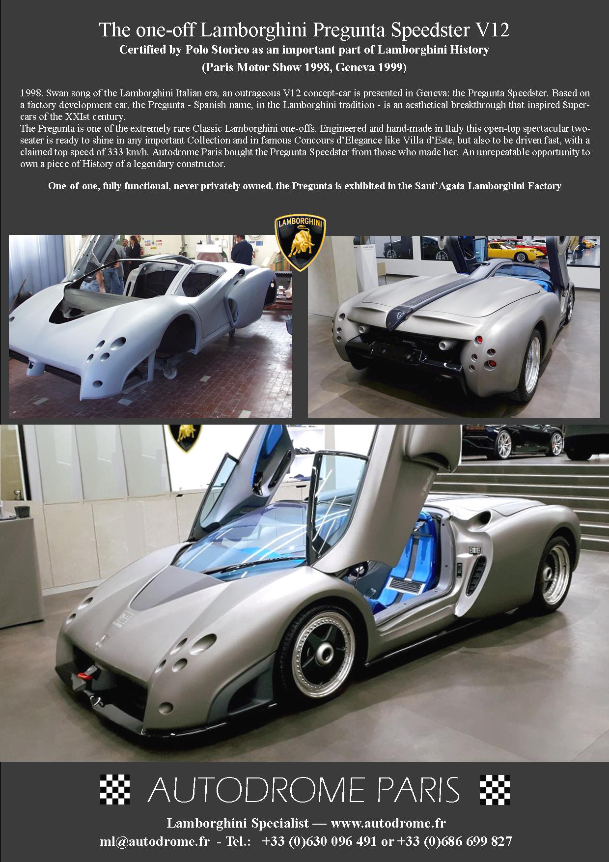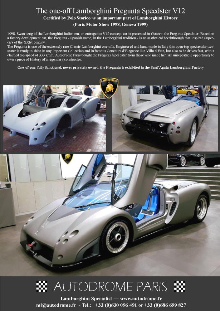 Autodrome entrusted the Lamborghini Pregunta to the Polo Storico for certification. This triggered the decision for Lamborghini to display this prototype - that we presented ourselves only one time, at the Rétromobile 2007 Show. This unique opportunity enabled Collectors and experts to examine this (perfectly operational) Lamborghini dream-car, as a swan song of the "Italian" period of the Sant’Agata make, and a statement of bold audacity and style.