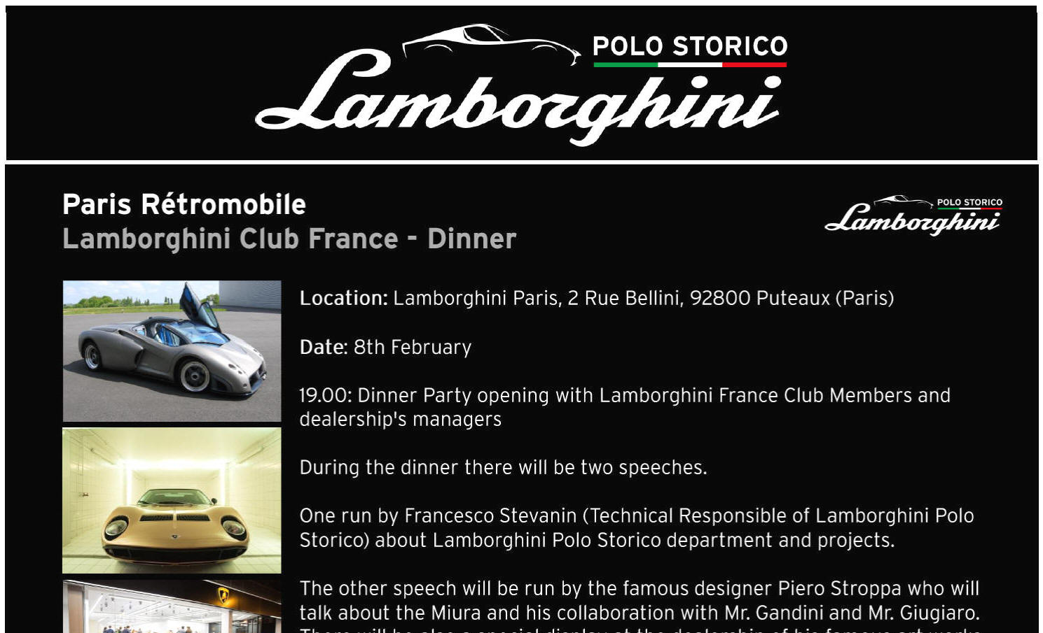 During the Paris Retromobile Classic Car Show, the Polo Storico of the Lamborghini factory and Autodrome, displayed the one-off Pregunta V12 (Geneva 1998) at the Lamborghini-Paris showroom. The presentation gathered on February 8th upon invitation, Lamborghini Clients & specialists, with a speech from Mr. Stevanin, Manager of Polo Storico, and from Piero Stroppa, designer and former assistant to Mr Gandini and Giugiaro.