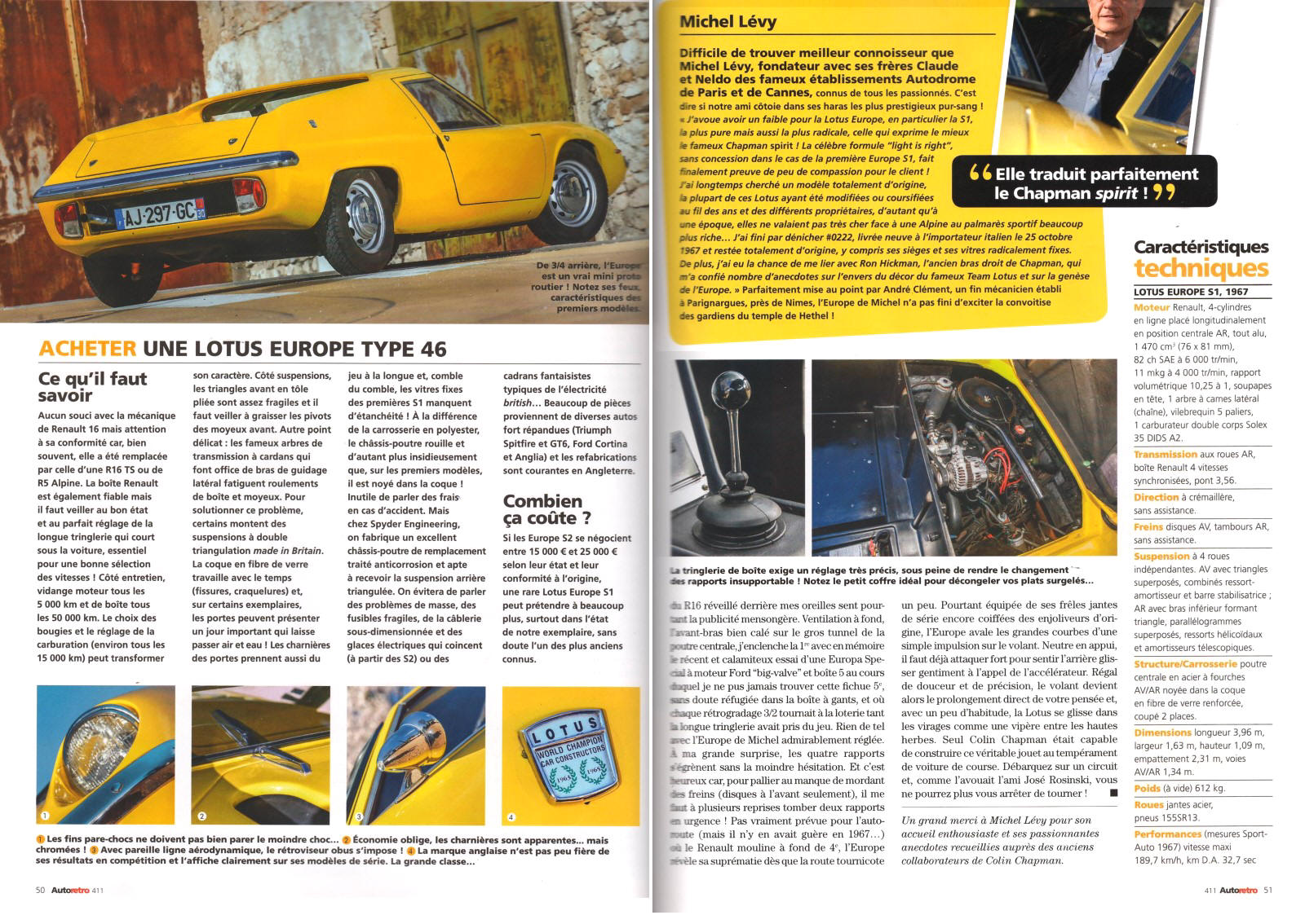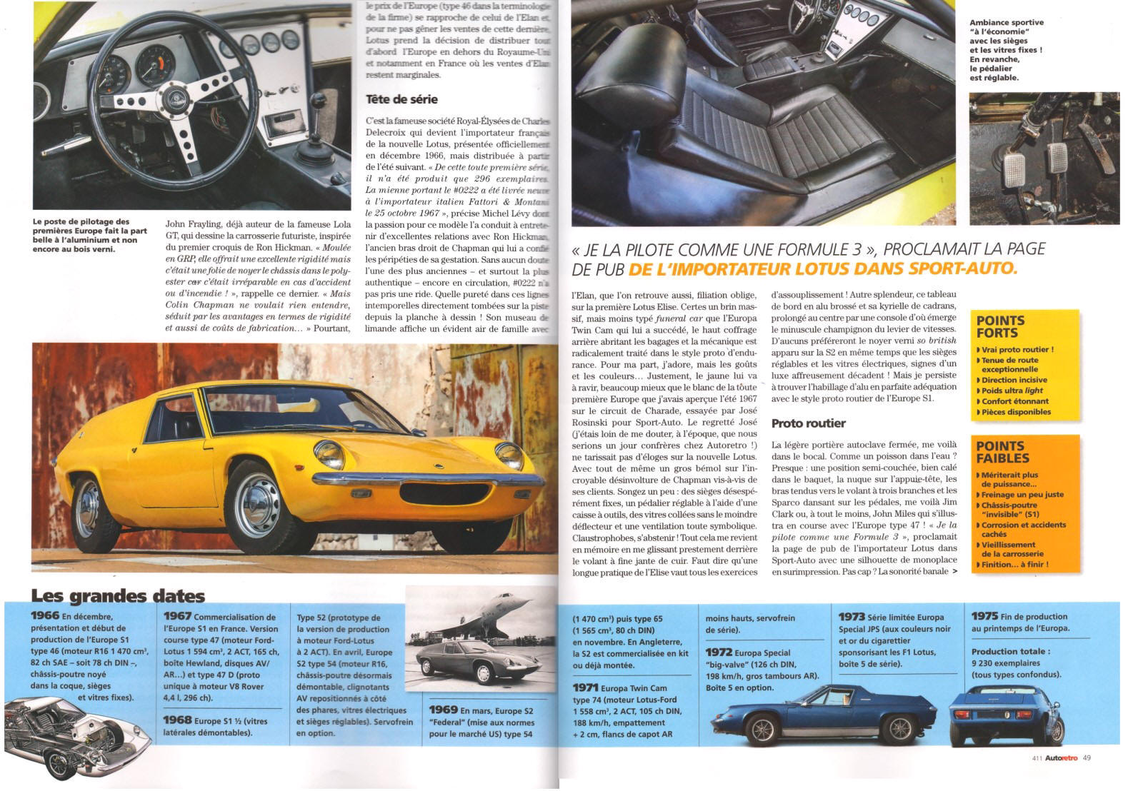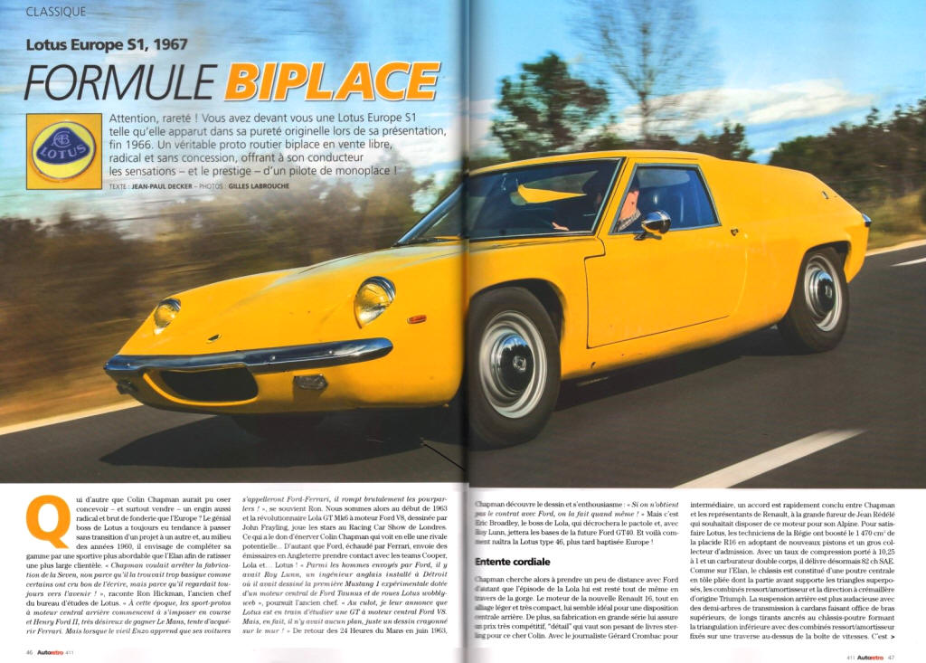 La très exacte et vivante description de la naissance de cette Lotus est instructive pour ceux qu'intéresse la période où les sportives n'étaient pas encore des super ni des hyper-cars, mais des Grand Tourisme, sans airbags ni direction assistée, et souvent même sans servofrein, dessinées et construites sans robots ni ordinateurs, et d'une finesse et d'une légèreté qui seraient absolument interdites et impossibles de nos jours. Au ras du sol, comme dans un prototype du Mans, l'Europe procure des sensations simplement irremplaçables.