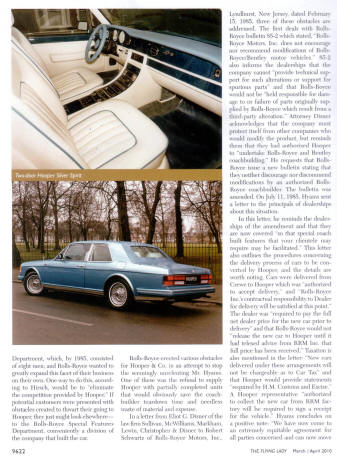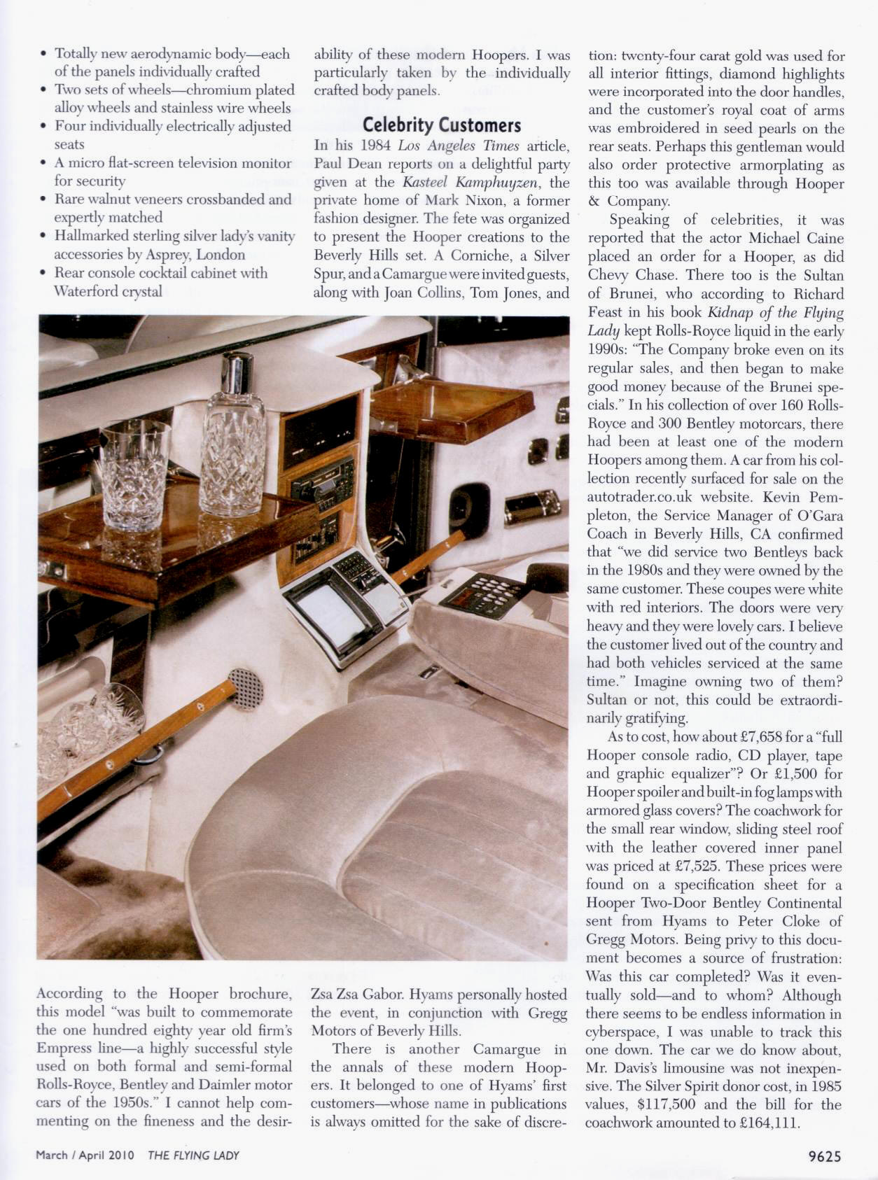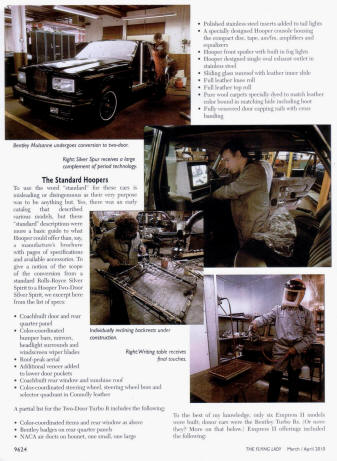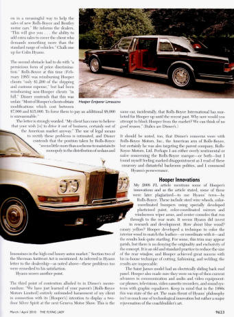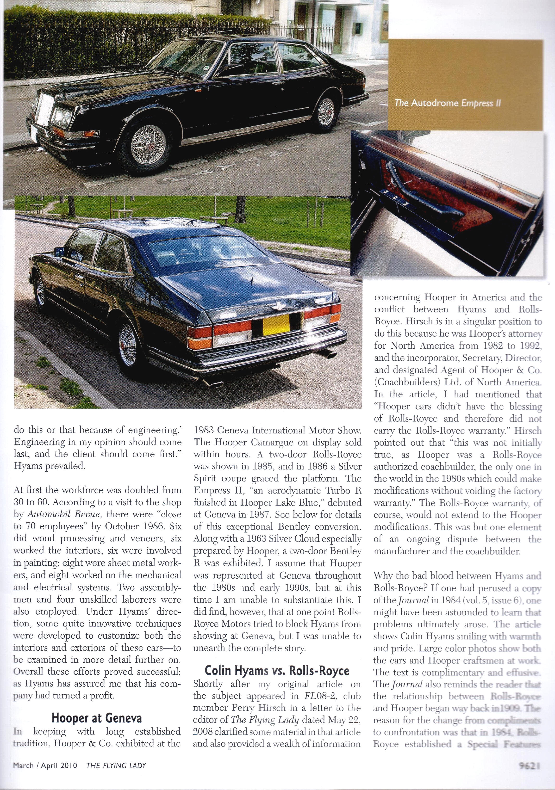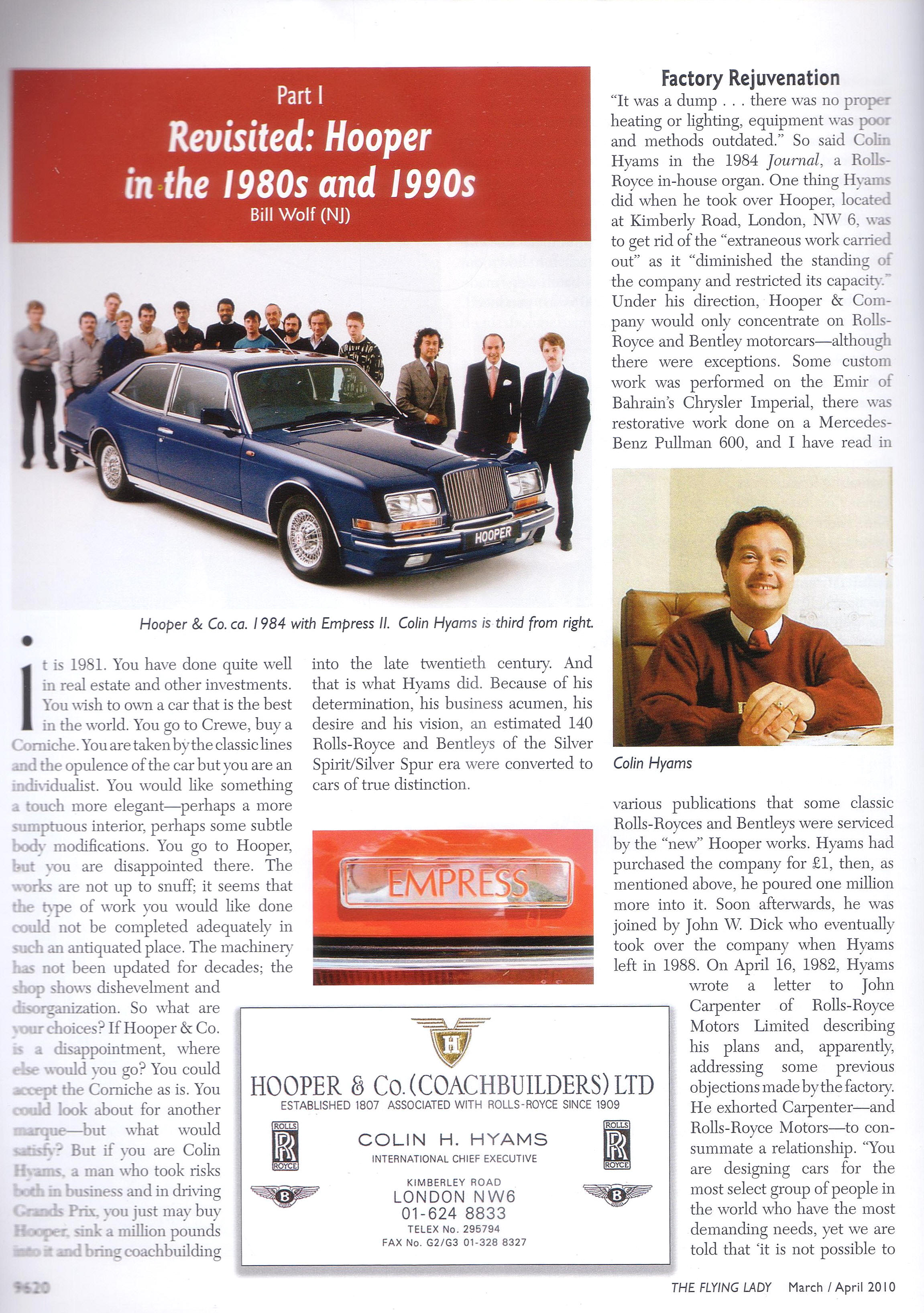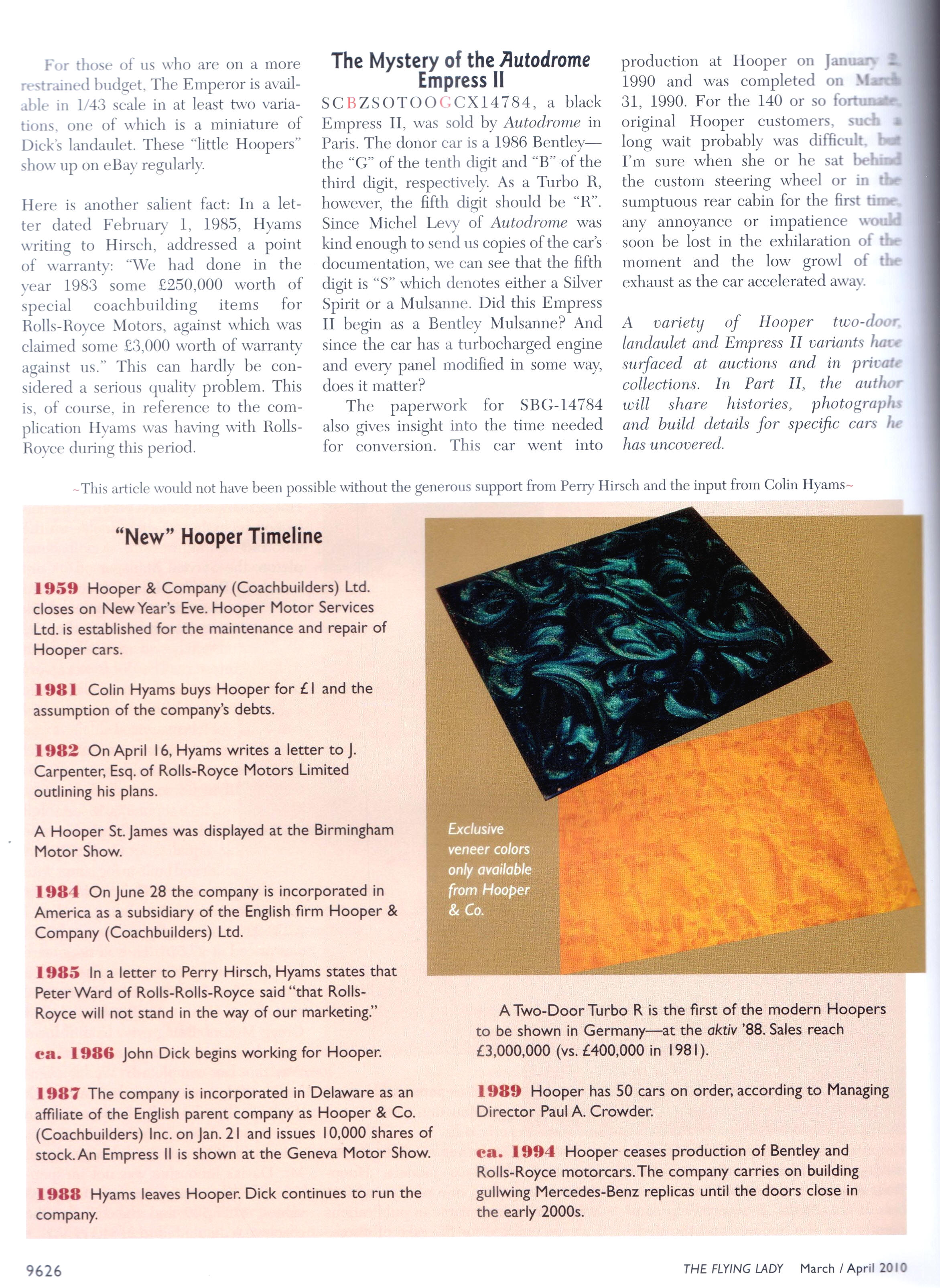 Dans un numéro récent de "The Flying Lady", la bible des collectionneurs de Bentley et Rolls-Royce, l'expert Bill Wolf analyse les relations complexes que ces marques entretenaient avec le carrossier Hooper. A cette occasion la Bentley Hooper Empress II anciennement propriété d'Autodrome, a été étudiée. Elle est très notable par sa rareté (on pense que trois exemplaires seulement on été réalisés, peut-être un ou deux de plus). Autodrome s'est fait un plaisir de fournir détails, photos et et renseignements aux historiens de "Flying Lady". La voiture est considérée par Bill Wolf comme "a Mystery"... qui s'interroge notamment sur le modèle exact qui a servi de base à sa réalisation.. La recherche est passionnante et nous restons en contact avec ces grands spécialistes de la marque en vue de faire aboutir cette enquête.