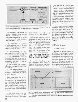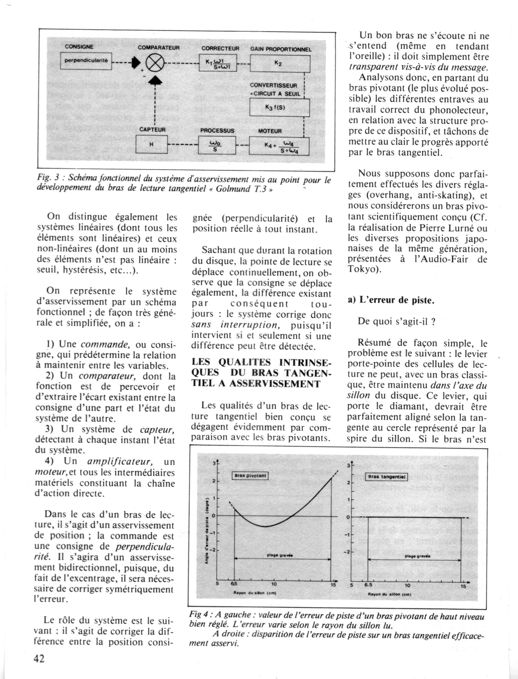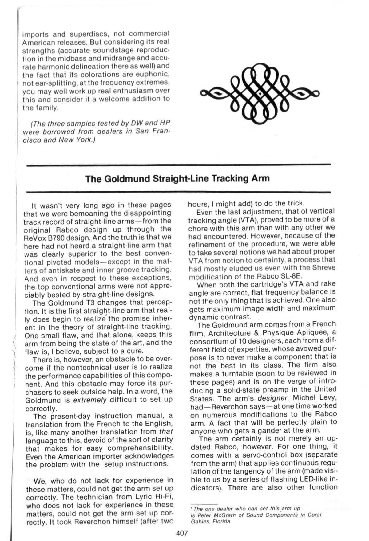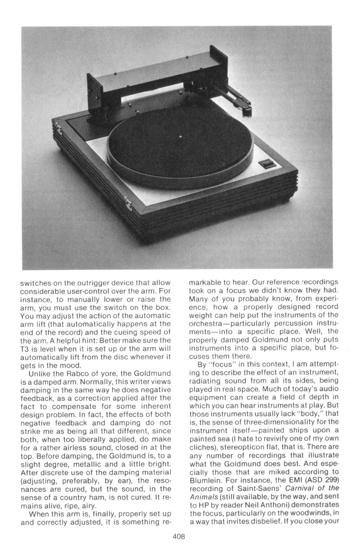 Tout d'abord est présenté le bras de lecture "Goldmund T-3" tangentiel. Ce bras de lecture pour disques vinyle, à asservissement électronique par photo-capteurs et micromoteurs, place en permanence la cellule phonolectrice et son diamant en perpendicularité parfaite avec le rayon du disque, exactement comme les machines à graver les microsillons. Très élaboré, l'appareil est usiné au micron près pour certaines pièces, et assemblé à la main.