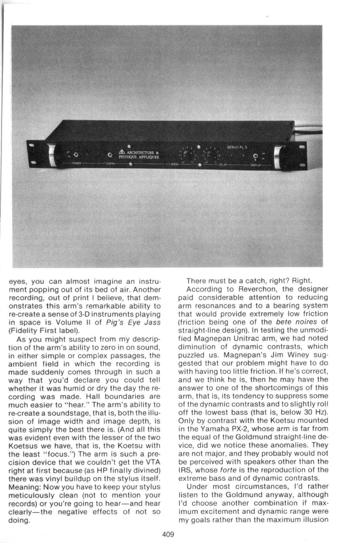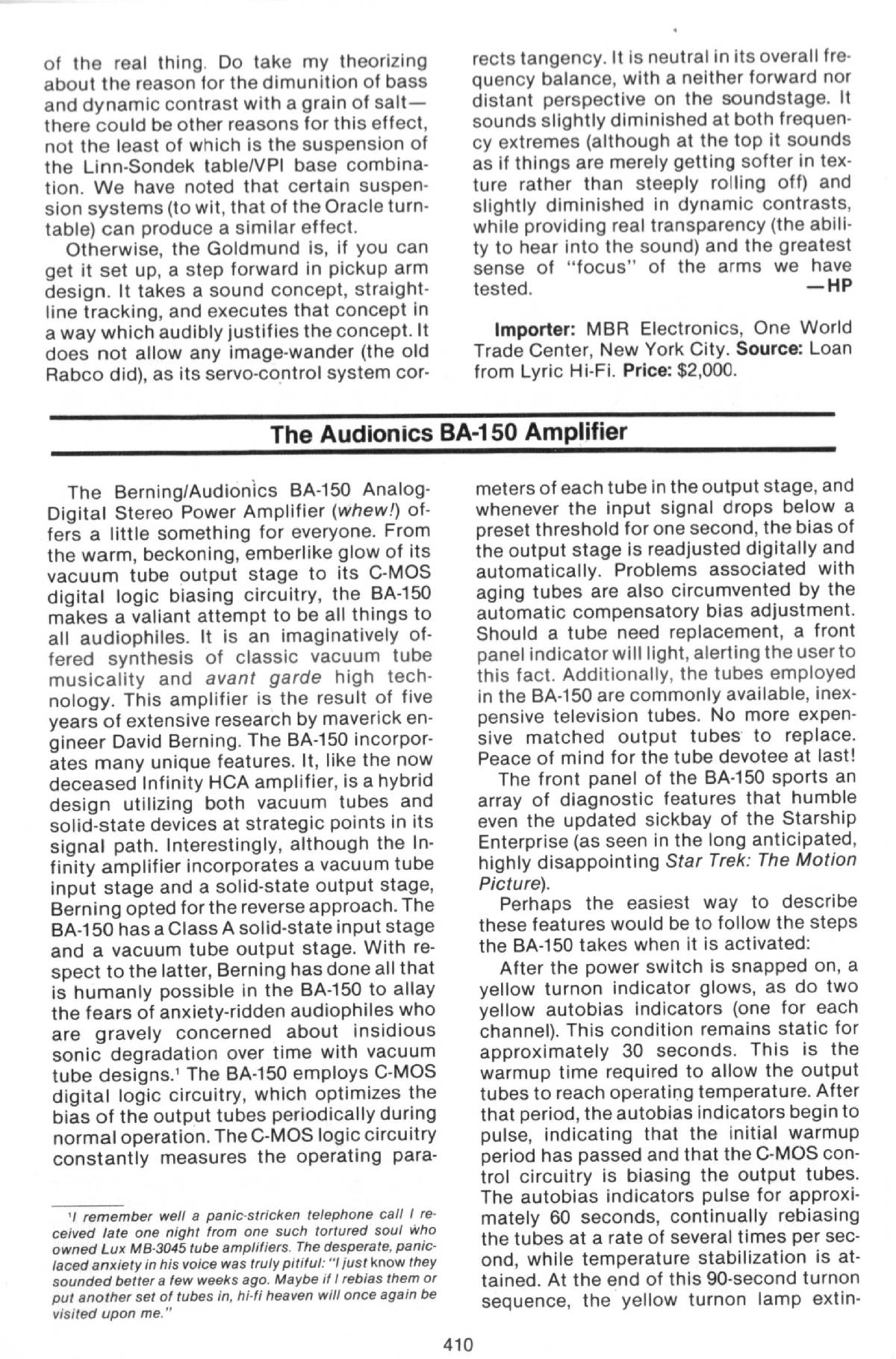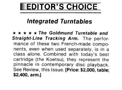 Les prix cités équivalent à environ 5000 Euros d'aujourd'hui pour la platine Goldmund Studio et à un peu plus de 6000 euros pour le bras de lecture à asservissement analogique Goldmund T3 - ils étaient, une fois n'est pas coutume, plus chers aux USA qu'en France, en raison de la marge du distributeur et des couts de transport, notamment.