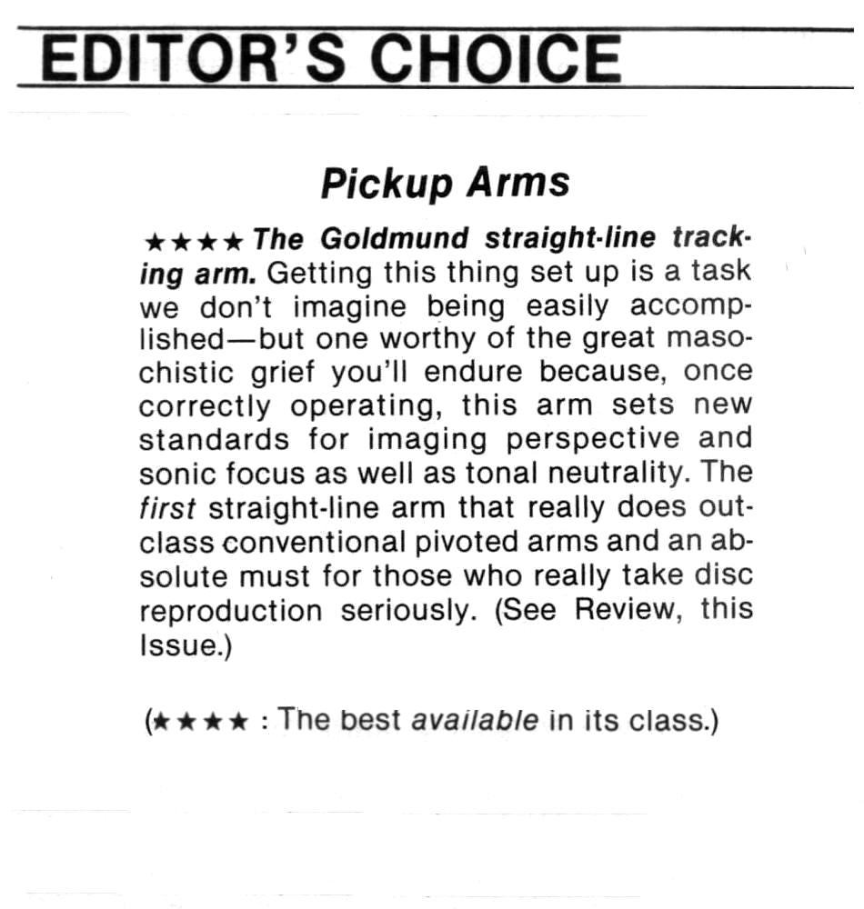 La Revue de référence Américaine THE ABSOLUTE SOUND décerne 4 étoiles ("the best available") au bras phonolecteur GOLDMUND