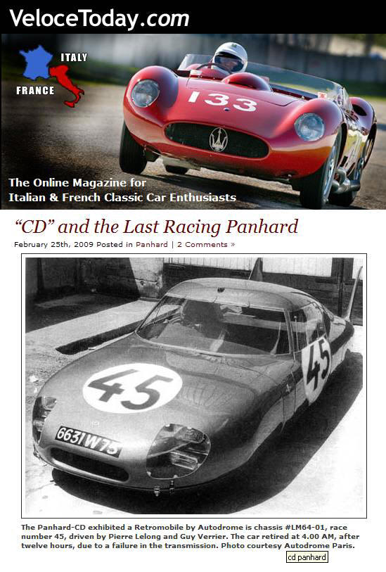 Le site Américain Veloce Today consacre un dossier à la CD-Panhard du Mans 1964 acquise par AUTODROME PARIS.