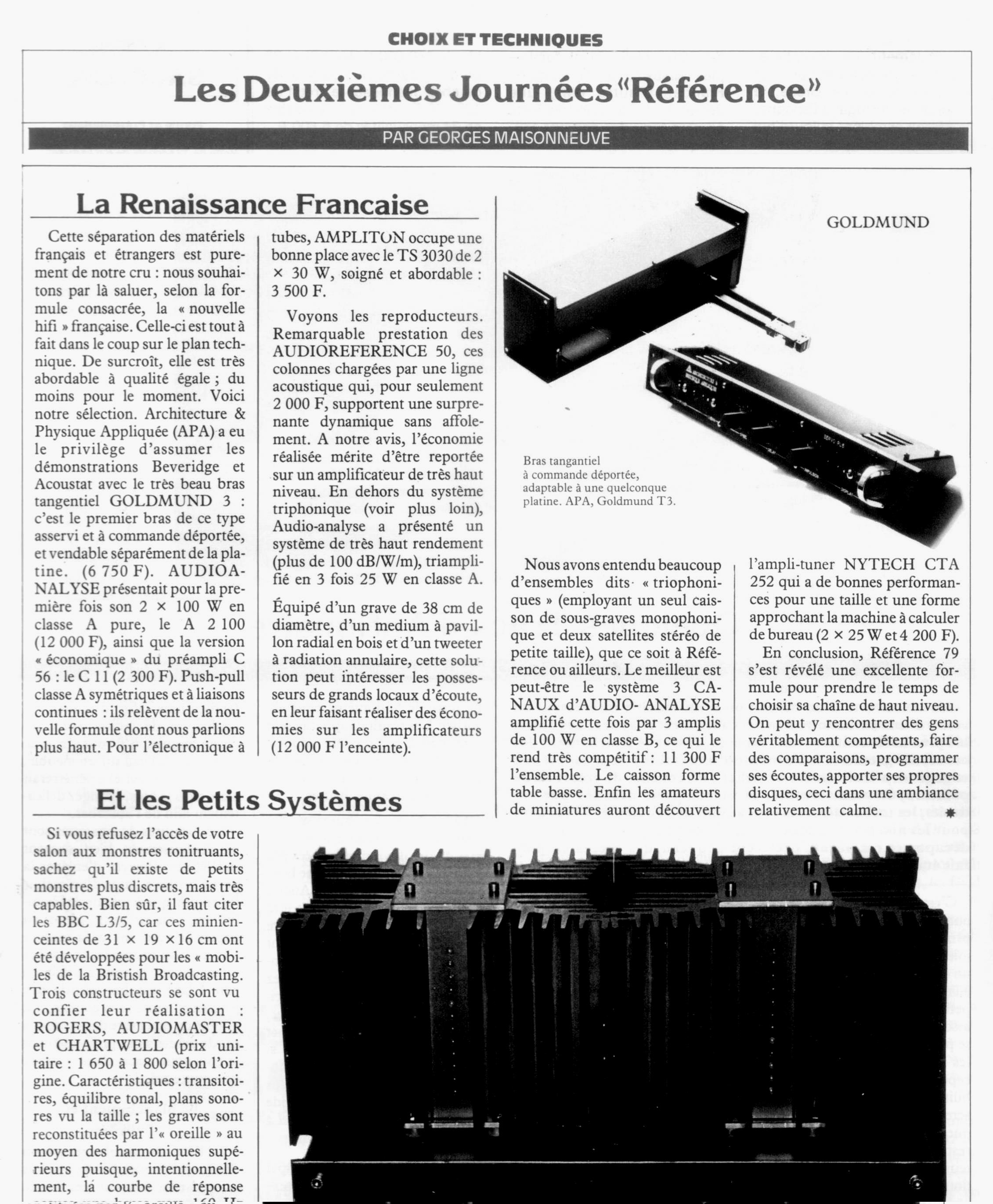 Traduction : "La performance de ces deux composants [platine tourne-disque et bras de lecture GOLDMUND] fabriqués en France, même utilisés séparément, est dans une classe à part. Combinées avec la meilleure cellule de lecture actuelle, la Koestu [modèle fabriqué à la main au Japon NDLR], ils représentent le pinacle actuel de la reproduction des disques."