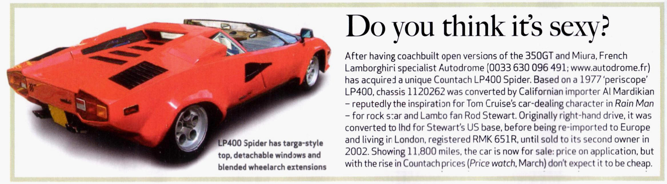 Le magazine anglais présente à ses lecteurs l'histoire exceptionnelle du Spider LP400 Countach, la seule Countach découvrable (connue sous le nom de l'ingénieur qui réalisa cette version, Mardikian). cette voiture stupéfiante fut la propriété de Rod Stewart durant presque toute sa vie, jusqu'à revenir en France où elle fut acquise par AUTODROME PARIS. La revue rappelle que le personnage de Mardikian, commanditaire de la conversion en Spider à la fin des années 70, i,nspira le personnage joué par Tom Cruise dans le film "Rain man". Le film commence par une longue séquence ou trois Lamborghini Countach sont débarquées auux USA sous les yeux de Tom Cruise-Mardikian, qui se battra ensuite pour les faire homologuer...