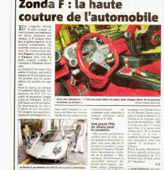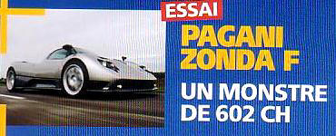 "En quinze secondes, vous pouvez passer de zéro à 200 km/h (9"8), puis de 200 km/h à zéro (4"4)...Juste le temps de vous broyer les cervicales, vous déboîter le poignet droit, vous retourner les tripes, et vous sortir les yeux des orbites. Ca fait envie, non ?. 1230 kg à sec ... En termes de rapport poids/puissance, la Maserati MC12 semble largement distancée". "Explosif ! La Zonda F développe un couple maxi à déraciner un chêne: 77,5 mkg à 4000 t/mn. Encore plus renversant lorsqu'on sait que l'Enzo délivre 67 mkg à 5500 t/mn et la Carrera GT... 60,1 mkg à 5750 t/mn.
