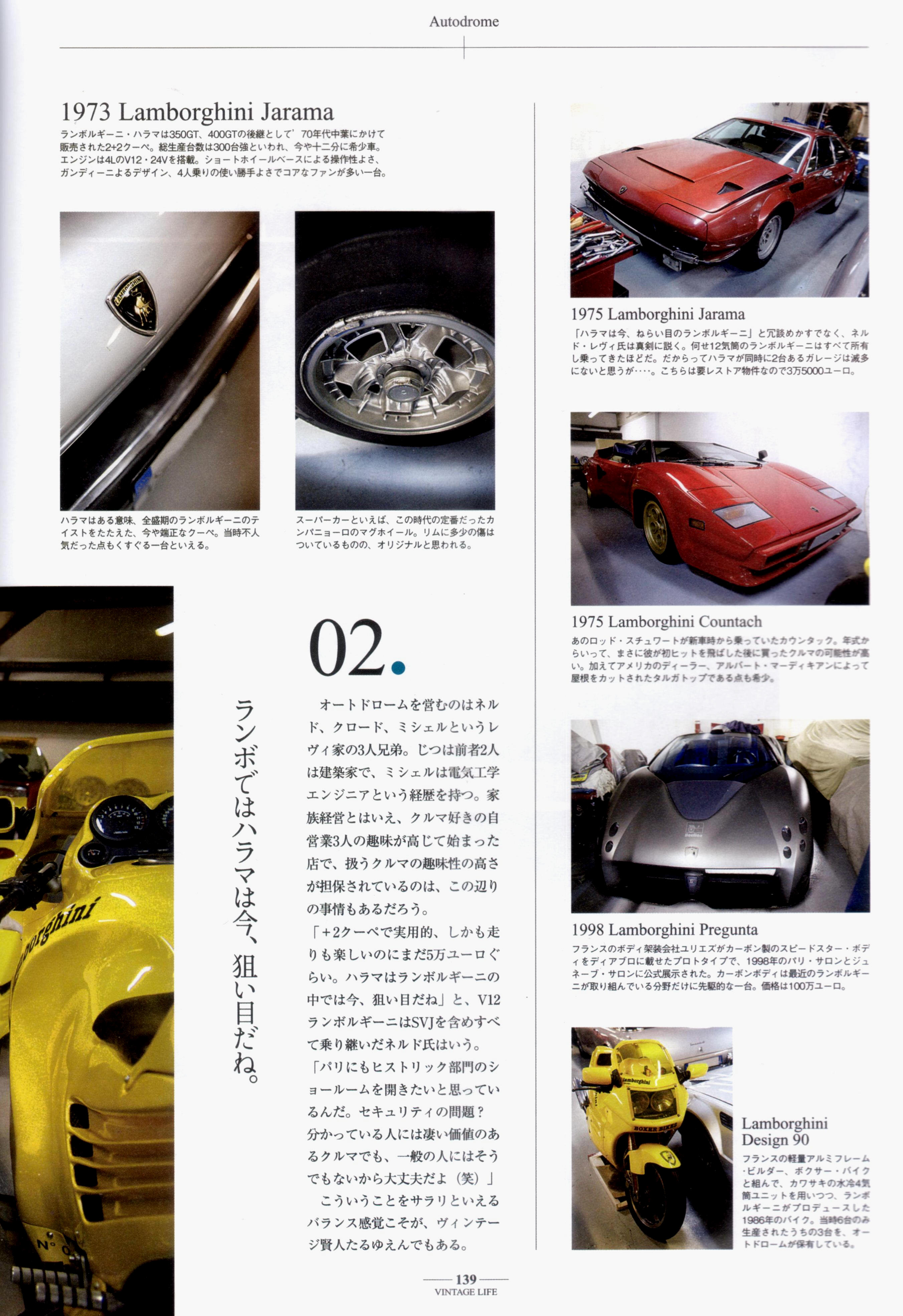 La célèbre revue japonaise, spécialisée dans les classiques hors-normes, notamment Lamborghini et Ferrari, a effectué voilà quelque temps un reportage sur Autodrome et ses plus fabuleuses Lamborghini classiques : "Special Lamborghini in France" - (cliquez sur la photo, 2 MB). La rédaction a présenté la fameuse et unique Miura SVJ Spider et notre rarissime et spectaculaire Motocyclette "vintage" Lamborghini.