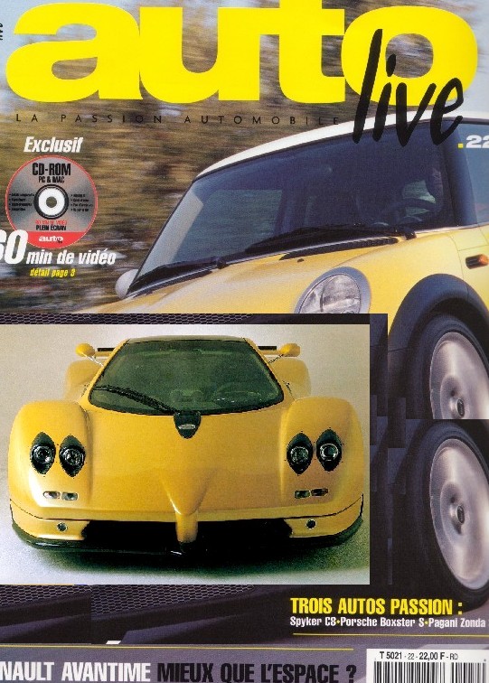 AUTO-LIVE A SON TOUR DITHYRAMBIQUE SUR LA ZONDA. Dans son numéro de Juillet 2001, la rédaction du magazine AUTO-LIVE s'enthousiasme elle aussi pour la Pagani Zonda C12S. La revue place la PAGANI dans la catégorie des "voitures de rêve", telles que la Bugatti EB110S, la Jaguar XJ220, la McLaren F1... La grande diffférence, que nous avons soulignée dès le début auprès de nos clients, est que la production de la gamme Pagani Autobili est là pour durer, adossée à une véritable entreprise de haute technologie (Modena Design), et avec un vrai carnet de commandes qui s'épaissit. Extraits de l'article : "Il faudra neuf ans pour que le rêve se concrétise..performances ahurissantes...poids plume...au coeur de cette structure siège un bijou technologique : un V12 AMG-Mercedes 7 litres...cette pièce d'orfèvrerie fournit la bagatelle de 550 chevaux et un couple pharaonique de 750 Nm. Pour comparer avec de simples voitures la référence en matière de couple s'appelle Chrysler Viper et ne fournit..que 664 Nm..." (La manoeuvrabilité inouïe et le plaisir extrême de la conduite de la Zonda reposent sur des faits que tous les experts reconnaissent désormais). Conclusion : "Admirez le travail..tout cela rappelle furieusement la Formule 1.." L'article est illustré de très belles photos exclusives d'un exemplaire jaune paille perlé...Un rêve devenu réalité.