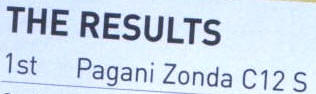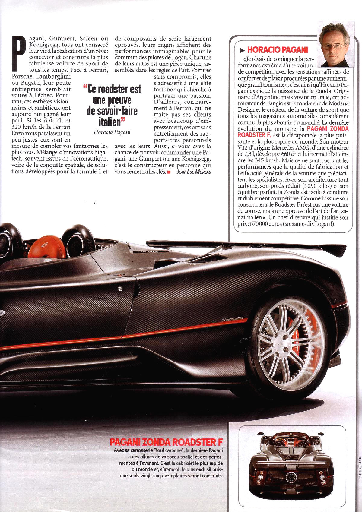C'est avec plaisir que les fanatiques de Pagani liront dans Sport-Auto de Décembre les deux pleines pages où est décernée la Palme d'Or de l'année à l' "oeuvre" (le mot est juste) d'Horacio Pagani, la Zonda F. La rédaction du magazine insiste notamment sur le rapport poids / puissance: "le niveau d'accélération et de poussée qui s'en dégage dépasse l'entendement". On ne peut mieux dire, mais il faut préciser que la puissance pure n'est pas le seul "secret" c'est surtout la débauche de couple disponible à bas régime - un record - qui emmène le poids-plume de la F à de tels sommets.