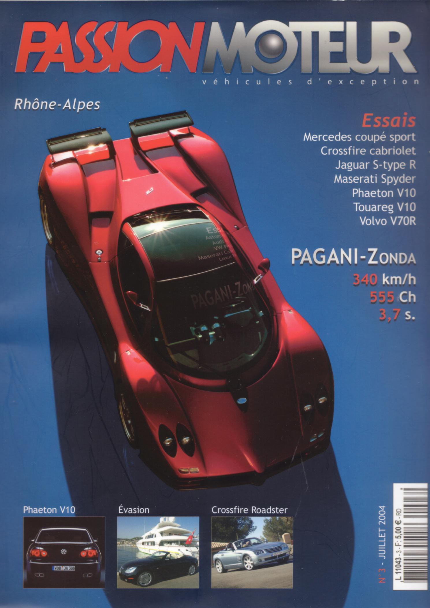 PASSION MOTEUR : ROUGE ZONDA ! Le magazine Passion Moteur, consacré exclusivement aux plus belles automobiles du monde, a récemment consacré une couverture et un long article à la Pagani Zonda (numéro de 07/2004). De nombreuses photographies de plusieurs exemplaires de la "supercar des supercars" sont proposées, avec une qualité d'impression assez exceptionnelle. En quelques années, la Pagani Zonda C12 S, qu'à peine une cinquantaine d'ultra-privilégiés peut conduire, est devenue l'automobile la plus fascinante du monde.