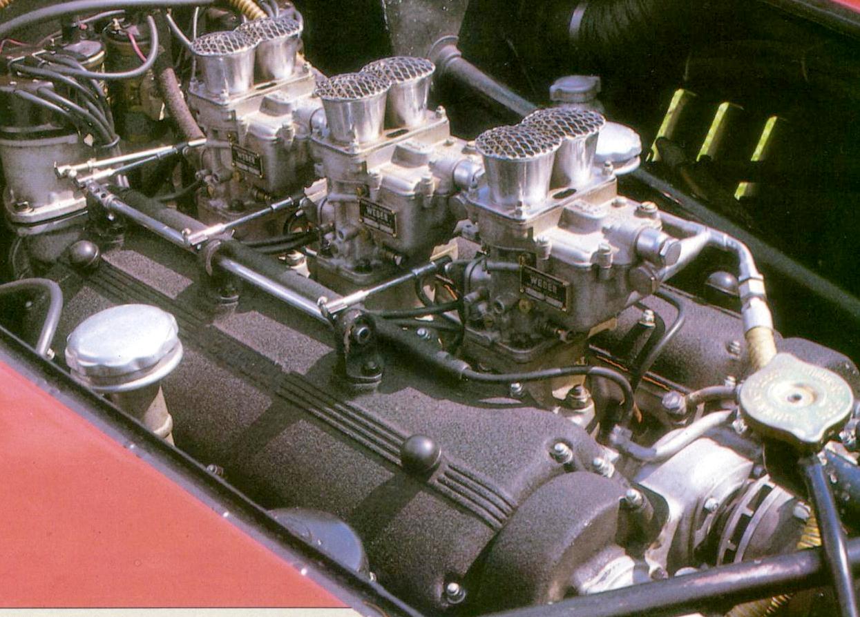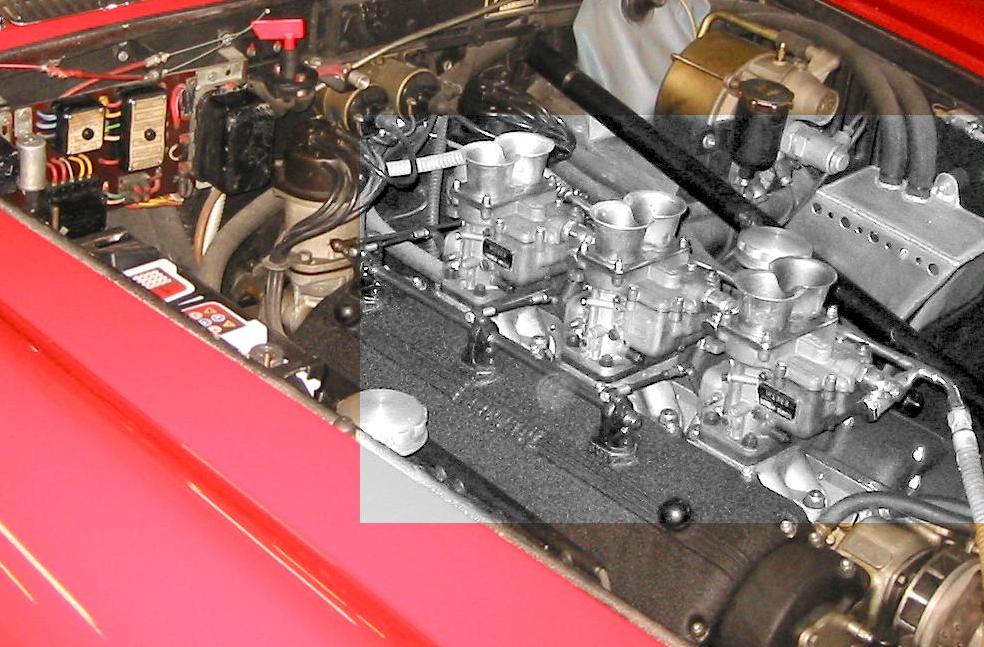 Comparez, sur les deux photos ci-dessous, le moteur de la 250 GT Pininfarina (à gauche) et celui de la Berlinetta Competizione "Tour de France" (à droite): ils sont de construction identique, à l'écrou près: carburateurs, arrivée d'essence, commande d'accélérateur, allumeur, cache arbre à cames...