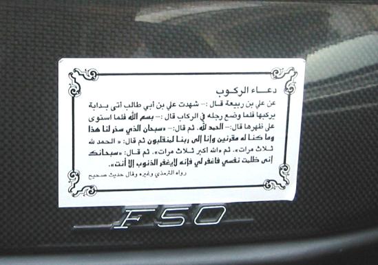 L'auto qui nous a été confiée appartient à un de nos clients du Moyen-Orient, collectionneur passionné. Sur le tableau de bord, figure un papillon de simple papier blanc, portant le texte d'une citation en langue arabe. Il s'agit de paroles prononcées selon la religion musulmane par Ali (cousin du prophète) au moment où il montait sur son cheval: " Au nom de Dieu. Dieu merci. Louange à Dieu qui a mis ceci à notre disposition et à lui nous retournons. Louange à Dieu, je me suis égaré sois Miséricordieux à mon égard".