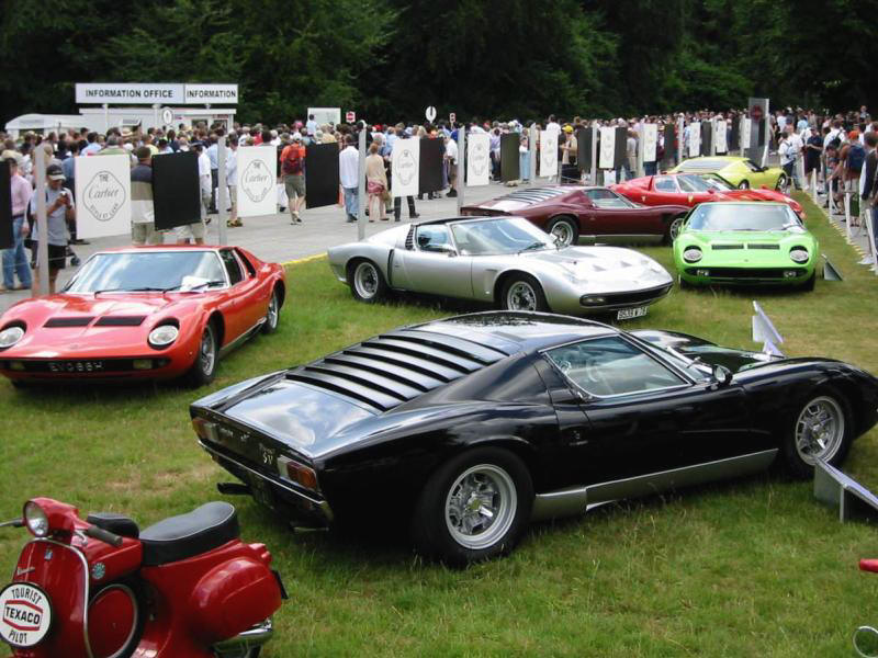 Rétrospective Miura à Goodwood, au centre la SVJ Spider. Au premier plan une SV, au fond, la maquette de la lourde "néo-Miura" présentée par l'usine.
