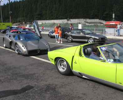 La SVJ Spider munie de son toit "targa": parfaite par temps incertain (restauration Autodrome-Lecoq). A droite, une rare palette de Lamborghini classiques réunies à Spa.