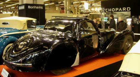 Le Coach Grand Sport dit "Jean Bugatti" ( 1933, 8 cylindres 4,9 litres, double ACT, à compresseur), merveilleusement présenté avec son intérieur