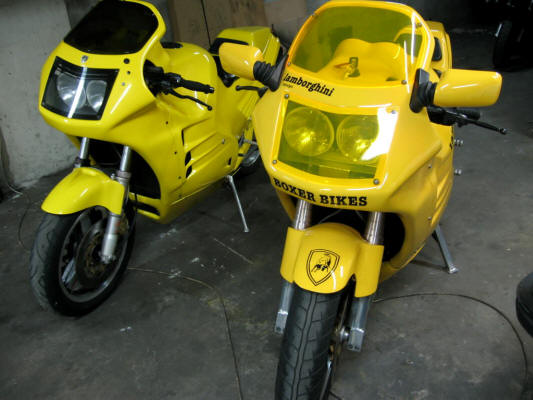 Nos deux exemplaires de la rarissime Motocyclette Lamborghini Design 90, conçue en collaboration avec Boxer-Bike,