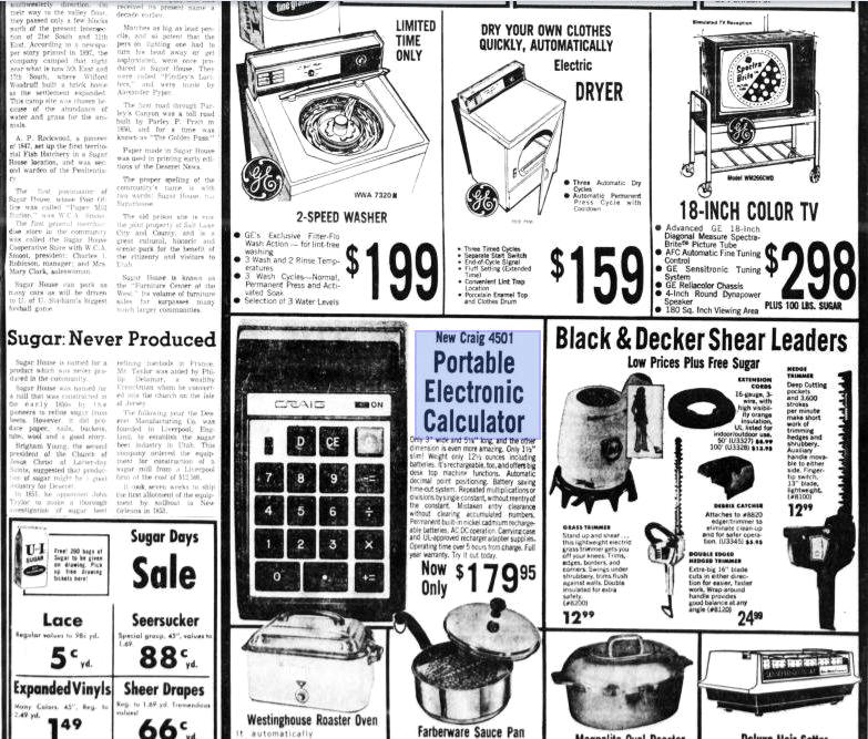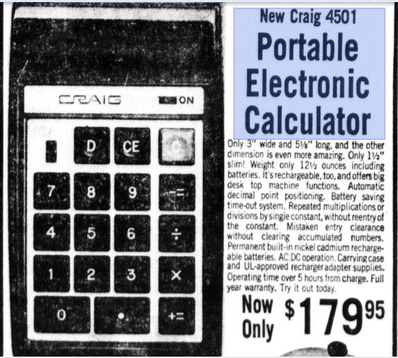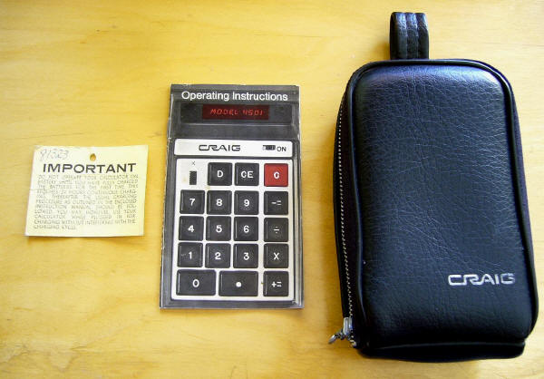 Parmi les tout premiers modèles - elle apparut en Septembre 1971 -, la Craig 4501 est l'une des plus connues - elle était en réalité produite par Bowmar (fabriquant de diodes) et commercialisée aussi sous cette marque. A l'époque, son prix équivalait à celui d'une machine à laver le linge et elle affichait fièrement une virgule flottante et la possibilité d'introduire une constante pour des calculs en chaine (conversion de monnaie par exemple). Cependant, les calculs étaient limités aux quatre opérations de base.