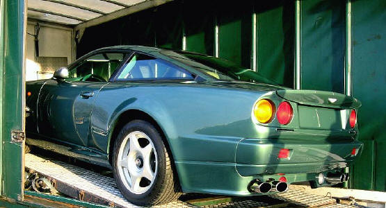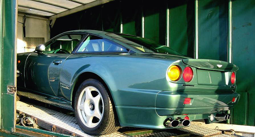 Nous avons des clients et amis collectionneurs à l'autre bout du monde : cette rare et très puissante Aston Martin Vantage Le Mans (quarante exemplaires numérotés) est l'ultime de toute la lignée des V8 de Newport-Pagnell...On comprend qu'elle intéresse les passionnés de tous pays. L'exemplaire qui est embarqué dans un camion sur la photo ci-dessous est une première main avec à peine 16.000 km, et quelques finitions "encore plus spéciales que spéciales", comme le retentissant échappement sport à quadruple sortie dont la sonorité restitue intégralement le galop sauvage des 612 chevaux...